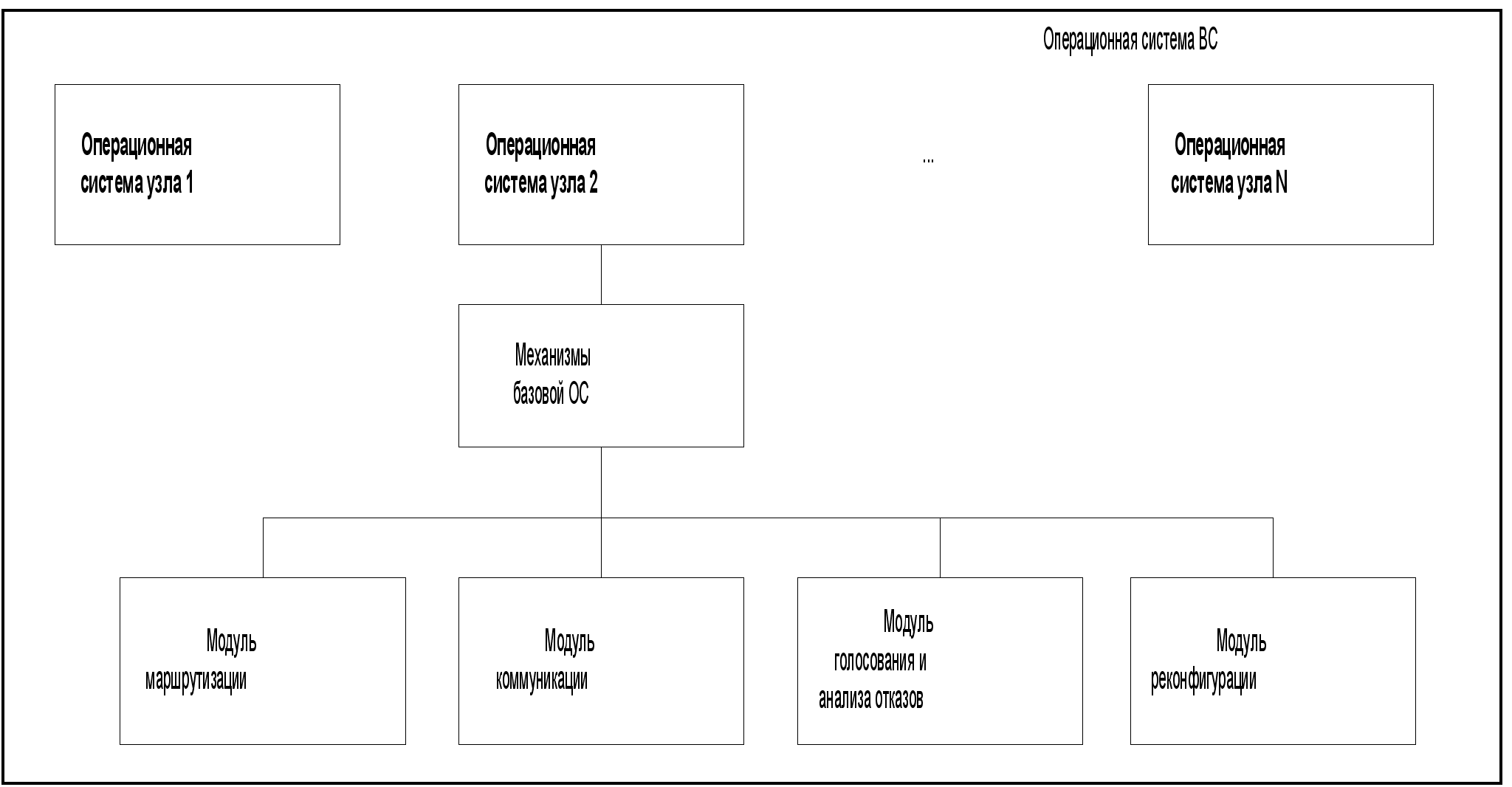 Рис. 6.1. Структура ВС Вторая часть служит для моделирования ПЭ системы и предназначена для отработки алгоритмов обеспечения отказоустойчивости в процессе непрерывного функционирования ВС. Анализ требований к функционированию ВС предопределил структуру распределенной операционной системы ВС, которая состоит из идентичных операционных систем узлов сети, отличных друг от друга лишь своим номером и содержанием системных таблиц, обусловленных размещением узла в сети ПЭ. Структура распределенной ОС представлена на рис. 6.2.