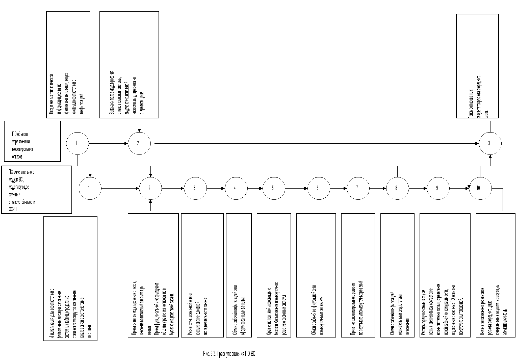 6.3. Разработка алгоритмов Разработка алгоритмов велась с учетом построенной на этапе системных исследований структурой ПО (см. рис. 6.2) и требований к нему. Наибольшее применение к настоящему времени получил структурный подход к технологии программирования, предполагающий нисходящую разработку, структурное программирование и сквозной структурный контроль. При нисходящей разработке проектирование и программирование ведутся сверху вниз. Для восходящего подхода характерен ряд трудностей, которых можно избежать при нисходящем подходе: каждый элементарный модуль может правильно работать со своей отладочной программой, но все модули вместе могут и не работать вследствие несогласованности или различной интерпретации спецификаций каждого модуля. 6.3.1. Структура программы Разработка структуры ПО отказоустойчивой ВС проводилась с помощью комбинации нисходящего и восходящего подходов. Сначала был выделен общий принцип работы ВС в целом, который можно представить в виде следующего графа управления (см. рис. 6.3).