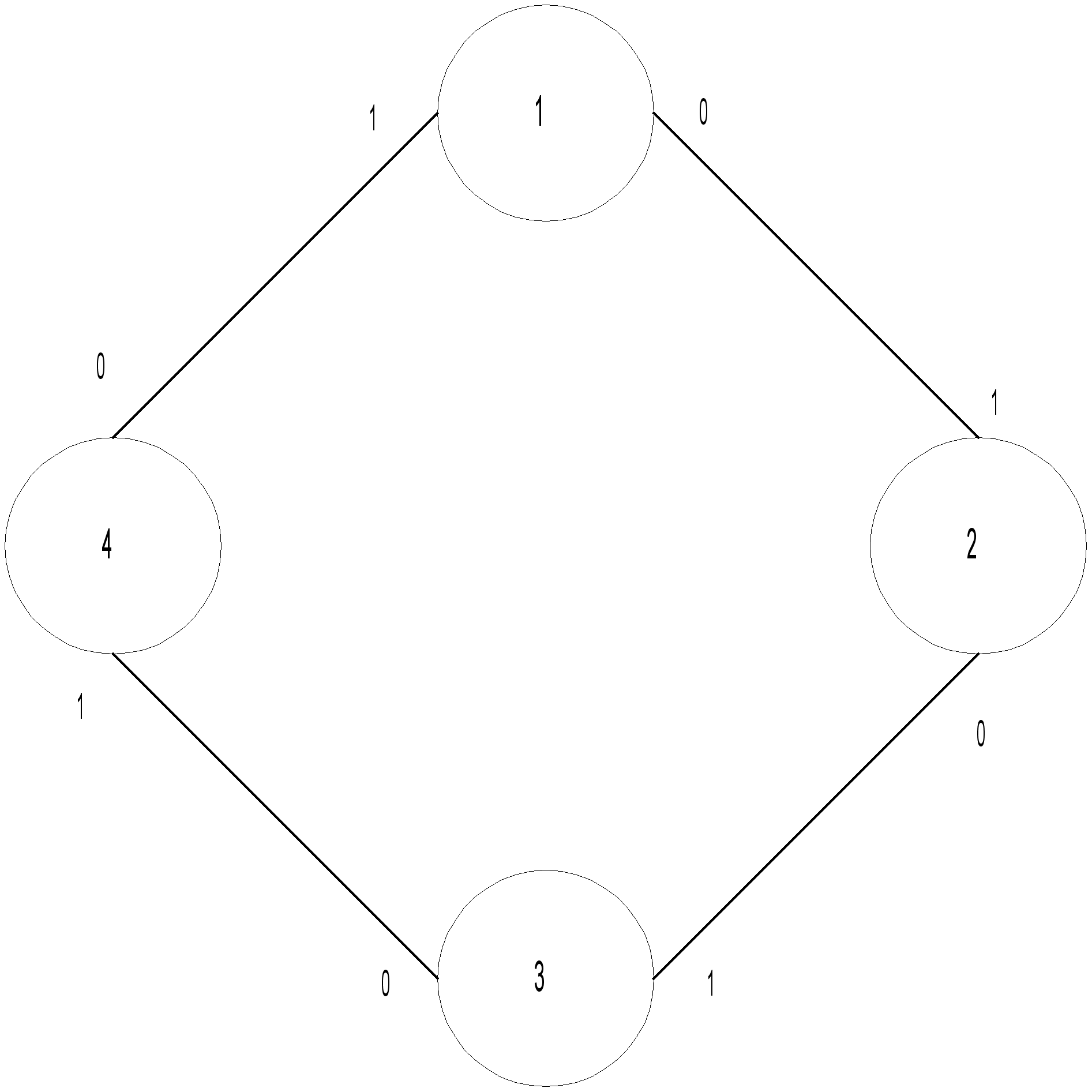 В дополнение к таблице связности, должна существовать таблица рассылки, в которой каждому ПЭ сопоставлен номер канала связи, по которому надо передать пакет дальше, чтобы он в конечном счете дошёл до адресата. Для полносвязной сети такая информация может показаться избыточной, однако если сеть неполносвязная или в ней произошли отказы связей, то таблица рассылки, формируемая на этапе инициализации и реконфигурации системы, позволит экономить время при обмене информацией или результатами голосования на каждом цикле. Составлением таблиц рассылки занимается модуль маршрутизации, структура и алгоритм работы которого будет рассмотрена ниже. Приведем пример таблиц рассылки. Для наглядности возьмем сеть из четырех ПЭ, представленную на рисунке 2.1.