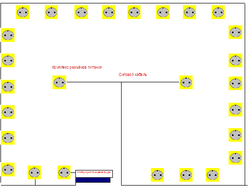 Приведенная ниже схема учитывает расположение рабочих станций на площади рабочего помещения. Каждая розетка на схеме обозначает комплекс разъёмов питания (2 розетки для рабочей станции, 3 розетки для серверов, розетки для периферийного оборудования). Силовой кабель рассчитывается по специальной методике исходя из мощности элементов питания (АТХ) кратной их количеству .