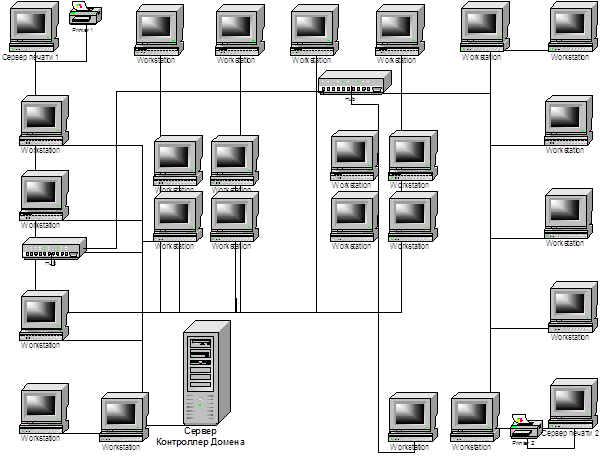 Технический проектПроектирование, расчёт и реализация проекта ЛВСПринимая во внимание, что необходимо обеспечить рабочими местами 25 операторов, и учитывая потребность в наличии (по минимуму) 1 системного администратора, 2 лаборанта можно сделать обоснованный вывод, что нам потребуется 28 компьютеров, сетевое оборудование, 2 принтера для сетевой печати. Обоснуем сетевую технологию: предлагается технология Ethernet потому, что при требуемой производительности имеет относительно небольшую стоимость, надёжность, кроссплатформенность, аппаратную независимость, ну и вообще используется повсеместно, и зарекомендовала себя. Рассмотрим конфигурацию компьютера удовлетворяющего по мощности требованиям рабочих групп. Потребуется 25 компьютеров для работы с офисными задачами т.е. средней мощности, 1 компьютер высокой мощности для установки на нем контроллера домена, серверных приложений и организации распределённого хранилища данных, а также 2 компьютера промежуточной мощности для серверов печати. Проанализируем конфигурацию компьютера-контроллера домена: