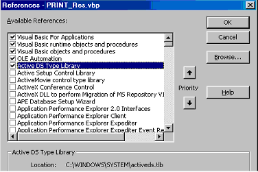 Рис 2.3. Подключение библиотеки Active DS Type Library В результате компилятор начинает “понимать” набор специализированных типов и методов. Метод GetInfo вызывается всякий раз при запросе новых данных, хранимых в каталоге. Метод SetInfo.В ADSI есть также метод SetInfo интерфейса IADs для уменьшения числа событий записи в каталог. При формировании нового объекта в пространстве имен можно использовать несколько свойств создания этого объекта, но только одну операцию записи обновления в каталоге. Как и системный реестр Windows, большинство каталогов оптимизированы для выполнения быстрых запросов, но это не относится к производительности записи. Для минимизации сетевой нагрузки кэш свойств ADSI позволяет выполнять одну операцию записи, которая наиболее оптимально ограничивает количество вызовов метода SetInfo. Анализируя поставленную цель можно сделать вывод, что задача должна быть реализована как два набора методов, первый – для управления файловыми ресурсами, второй – для управления ресурсами печати. Служба активного каталога ADSI предоставляет для этого мощные программные интерфейсы, инкапсулированные в стандартную библиотеку, в данном случае языка MS Visual Basic, которая называется Active DS Type Library. Данная библиотека представляет собой библиотеку типов данных, манипулируя которыми программист получает доступ к требуемым ресурсам и их свойствам. Интерфейсы ADSI IADsFileService, IADsFileServiceOperations и IADsFileShare позволяют перечислять совместно используемые ресурсы и управлять ими на выбранном компьютере, а комбинируя эти интерфейсы с IADsContainer, можно создавать новые совместно используемые файловые ресурсы. После создания новых ресурсов можно просматривать и управлять сессиями, которые ассоциированы с каждым открытым ресурсом. Загружая в коллекцию (интерфейс IADsCollection) содержимое динамического интерфейса IADsSession, можно программно просматривать и удалять пользовательские сессии, подключенные к каждому совместно используемому файловому ресурсу. Интерфейсы ADSI IADsPrintQueue и IADsPrintQueueОperations позволяют перечислять задания существующей очереди печати и управлять ею. Для просмотра заданий печати очереди и управления ими можно использовать интерфейсы IADsPrintJob И IADsPrintJobOperations. С помощью описанных интерфейсов и приведенного в приложениях данной работы кода можно создавать программы для управления: - файловыми ресурсами; - файловыми сессиями; - открытыми ресурсами; - ресурсами печати. Управление файловыми ресурсами. С помощью интерфейсов IADsFileService, IADsFileServiceOperations, IADsFileShare, IADsSession и IADsContainer можно программно создавать и удалять совместно используемые файловые ресурсы. Эти интерфейсы также можно применять для просмотра открытых сессий и ресурсов. Для перечисления совместно используемых ресурсов компьютера в первую очередь необходимо связать контейнер LanmanServer с конкретным компьютером. Основной принцип, использования ADSI – объектно-ориентированный подход. Команда GetObject связывает объект типа IADS c требуемыми значениями переменных, содержащих имена используемого домена, компьютера и контейнера LanmanServer. Далее, обращаясь к методам нужных классов и слою абстракций ADSI, вызываются требуемые функции API, позволяющие управлять свойствами и возможностями системных служб ОС Windows NT/2000. Значения переменных ComputerName, ComputerDomain, PrintQueueName и других, обозначающих имена сетевых ресурсов, используются как входные па
