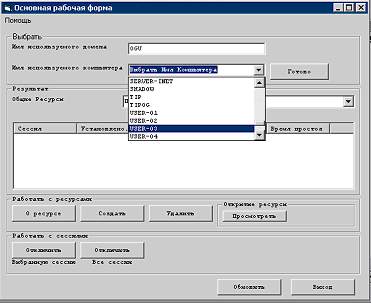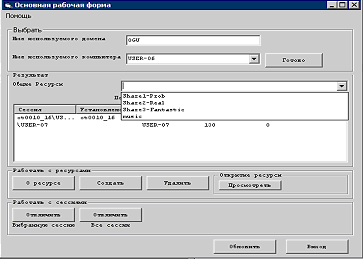 Рис 2.6. Создание нового общего ресурса и получение его в соответствующем списке основной рабочей формы путём нажатия кнопки “Обновить”. Программа поддерживает и удаление ресурсов, а также и изменение их свойств, как заданных в предыдущем шаге – в момент создания, так и те которые я генерирую “по умолчанию”. Например, максимальное количество подключений при создании с помощью fileUPR автоматически устанавливается неограниченное, так как в большинстве случаев, в том числе и при использовании стандартных утилит Windows администраторы используют именно это значение. Аналогично управляем файловыми сессиями. Значительная часть процесса разработки программного обеспечения приходится на его отладку и тестирование. Основная масса затруднений, с которыми пришлось столкнуться при написании кода, связана с использованием ссылок и компонентов, а также с ограниченность прав: не каждый пользователь домена может получить информацию об объектах Active Directory, а тем более менять свойства объектов и управлять ими. Определённая доля трудностей возникла на начальном этапе разработки при передаче данных между разными формами одного проекта. Готовое откомпилированное приложение получилось очень компактным (как в плане занимаемого пространства жесткого диска так и в интеграции функций и возможностей в пределах рабочих форм ). Необходимо отметить, что программный проект лояльно относится к ресурсам аппаратуры, т.е. для устойчивой работы не требует больших вычислительных мощностей. Основные временные задержки возникают при перечислении большого количества элементов, например компьютеров домена или длинных очередей печати, однако даже они устойчиво обрабатываются процессорами с тактовой частотой порядка 400 МГц. В ходе написания программного кода было встречено несколько ошибок, исправить которые не удалось и для реализации необходимых действий пришлось использовать другие методы и пути. Например, внутри целочисленного цикла один и тот же ресурс запрашивается дважды, чем вызывает ошибку “Object required”, при этом если считываются ресурсы главного сервера (в моём случае \\MASTER), то их имена перечисляются корректным образом. При использовании библиотеки ADSI часто возникают ошибки при связывании свойств объектов. Используется строгий синтаксис и правила корректного обращения с службам (Например LAN Manager). Такие ошибки приводят к нарушению автоматизации использования свойств объектов “Automation Error”. И третья, наиболее частая ошибка – “Ошибка доступа” связана как раз с нехваткой прав для совершения определённых операций (Например, создание общего ресурса или просмотр пользовательских сессий). Ну и ошибки преобразования и переполнения типов “Type mismatch”, а также “Variable not default” были обработаны по мере приближения к завершению разработки. Потенциальной проблемой, в ходе разработки стало завершение работы приложения Visual Basic при отсутствии прав администратора в момент использования элементов управления ActiveX. Выходом из сложившейся ситуации стало использование прав администратора на локальной машине – в итоге ошибка, определённая выше как третья сохраняется, но Visual Basic работает корректно. Кроме ошибок, возникших при выполнении проекта пришлось столкнуться с некоторыми неудобными моментами, например при работе с объектом ListView – комбинированный та