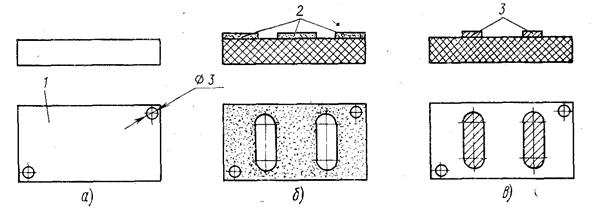 Рисунок 1 - Схема получения печатных проводников электрохимическим методом: а – заготовка платы из нефольгированного диэлектрика с технологическими отверстиями; б – негативный рисунок схемы проводников; в — плата с печатными проводниками; 1 — основание платы; 2 — резист; 3 — печатные проводники платы. Электрохимический метод заключается в нанесении на плату фоторезиста и получение негативного рисунка схемы. Незащищенные участки платы, соответствующие будущим токоведущим проводникам, металлизируются химическим, а затем электрохимическим способами в соответствии с рисунком 1. При этом металлизируются все монтажные отверстия, предназначенные для установки навесных элементов и электрической связи проводников при их двустороннем расположении. Этот метод осуществляется посредством следующих операций: 1 Входной контроль листа диэлектрика; 2 Резка заготовок; 3 Сверление базовых технологических отверстий; 4 Сверление монтажных отверстий на станке с ЧПУ; 5 Подготовка поверхности; 6 Химическое меднение; 7 Усиление меди гальваническим меднением; 8 Получение защитного рисунка на пробельных местах; 9 Гальваническое меднение; 10 Гальваническое покрытие сплавом олово-свинец; 11 Удаление защитного рельефа; 12 Травление меди с пробельных мест; 13 Обработка по контуру; 14 Контроль по ТУ. 4.3 Установка нанесения сухого пленочного фоторезистаВ настоящее время разработаны новые способы и устройства нанесения сухого пленочного фоторезиста, обеспечивающие высокую точность нанесения и исключающие потерю фоторезиста. Возрастающие требования к точности и качеству схем, необходимость автоматизации процессов и рост объемов выпуска плат привели к замене жидких фоторезистов сухим пленочным фоторезистом (СПФ). В настоящее время как у нас в стране, так и за рубежом разработаны и внедрены сухие пленочные фоторезисты.
