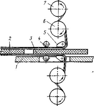 Рисунок 2 - Принцип работы установки для двустороннего нанесения пленочного фоторезиста: 1 – стол; 2 – заготовка платы с нанесенным фоторезистом; 3 – металлизированная заготовка платы; 4 – прижимные протягивающие валки; 5 – нагревательные плиты; 6 – барабан с фоторезистам; 7 – барабан с защитной пленкой. На рисунке 2 показан принцип работы установки, предназначенной для двустороннего нанесения пленочного фоторезиста в условиях серийного изготовления плат. Адгезия СПФ к металлической' поверхности заготовок плат обеспечивается разогревом пленки фоторезиста на плите до размягчения с последующим прижатием при протягивании заготовки между валками. Установка снабжена термопарой и прибором контроля температуры нагрева пленки фоторезиста. На установке можно наносить СПФ на заготовки шириной до 600 мм со скоростью их прохождения между валками 1,0-3,0 м/мин. Фоторезист нагревается до температуры 110-120 °С. 4.4 Анализ дефектов фотопечатиТаблица 3.