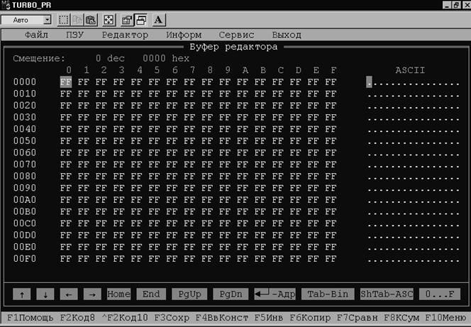 Рисунок 3 – Окно программы Turbo. Питание программатора можно включать и выключать как до запуска программы «turbo_pr.exe», так и в процессе ее выполнения. Перед выполнением любой команды работы с ПЗУ (чтение, прожигание, проверка на чистоту и т.д.) программа всегда проверяет готовность программатора. Если программатор не включен или вообще не подключен к компьютеру, то выдается сообщение «Программатор не готов» и команда не выполняется. Можно запустить программу в демонстрационном режиме, при котором готовность программатора не проверяется. Для этого надо набрать в командной строке «turbo_pr D» и нажать клавишу Enter. Работа с программатором осуществляется с использованием системы меню и, как правило, не вызывает затруднений. В программе предусмотрена контекстная помощь (при нажатии клавиши F1 на экран выводится страница помощи, соответствующая выбранному пункту меню). В процессе выполнения программы на экране постоянно отображается информация буфера, который представляет из себя ОЗУ объемом 64 Кбайт. Этот буфер используется как приемник информации при чтении с ПЗУ и как источник информации при программировании или проверке ПЗУ. Рабочая область буфера задается пользователем перед выполнением каждой команды, использующей буфер. При выборе соответствующего пункта меню (например, «Чтение с ПЗУ») на экране появляется диалоговое окно, в котором можно задать начальный и конечный адреса буфера, а также начальный адрес микросхемы ПЗУ. По умолчанию (если ничего не менять) задано нулевое значение для начального адреса буфера и начального адреса микросхемы, а для конечного адреса буфера задано максимальное значение адреса выбранной микросхемы. Если требуется читать, программировать или проверять не всю микросхему, а только ее часть (а также в том случае, когда требуется использовать не начальную область буфера), надо изменить адреса, заданные по умолчанию. Пусть, например, требуется запрограммировать ячейки с адресами 50...7F информацией из буфера, начиная с адреса 250 (все адреса задаются в 16-ричном коде). Тогда надо задать начальный адрес буфера равным 250, начальный адрес ПЗУ равным 50, а конечный адрес буфера 27F. Объем памяти микросхем 271000, 28F010, 28F020 и КМ1801РР1 превышает размер буфера. Такие микросхемы условно разбиты на несколько частей (по 64 Кбайт каждая). Каждая часть представлена в списке выбираемых микросхем как отдельная микросхема, к названию которой добавляется символ нижнего подчеркивания и порядковый номер (например, 271000_1, 271000_2). Команды чтения, прожигания и проверки для этих микросхем выполняются только для выбранной части микросхемы. Команда «Проверка на чистоту» выполняется для всей микросхемы, независимо от того, какая часть выбрана. В меню «Сервис» есть пункт «Алгоритм программирования», с помощью которого для некоторых микросхем можно задавать альтернативные алгоритмы программирования. Ниже приводится краткая информация об алгоритмах, используемых в программаторе. Алгоритм «Паспорт» обеспечивает программирование микросхемы ПЗУ в соответствии с временными диаграммами, приводимыми в литературе. Алгоритмы «Standard» и «Intelligent» применяются для микросхем с ультрафиолетовым стиранием. Алгоритм «Standard» реализует выдачу одного программирующего импульса длительностью 50 мсек. при программировании каждого байта. Алгоритм «Intelligent» об
