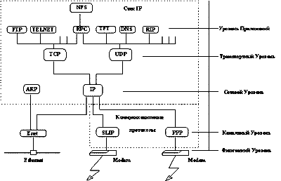 Рисунок 1.4 Вся схема (рисунок 1.4) называется стеком протоколов TCP/IP или просто стеком TCP/IP. Чтобы не возвращаться к названиям протоколов расшифруем аббревиатуры TCP, UDP, ARP, SLIP, PPP, FTP, TELNET, RPC, TFTP, DNS, RIP, NFS: TCP - Transmission Control Protocol - базовый транспортный протокол, давший название всему семейству протоколов TCP/IP. UDP - User Datagram Protocol - второй транспортный протокол семейства TCP/IP. Различия между TCP и UDP будут обсуждены позже. ARP - Address Resolution Protocol - протокол используется для определения соответствия IP-адресов и Ethernet-адресов. SLIP - Serial Line Internet Protocol (Протокол передачи данных по телефонным линиям). PPP - Point to Point Protocol (Протокол обмена данными "точка-точка"). FTP - File Transfer Protocol (Протокол обмена файлами). TELNET - протокол эмуляции виртуального терминала. RPC - Remote Process Control (Протокол управления удаленными процессами). TFTP - Trivial File Transfer Protocol (Тривиальный протокол передачи файлов). DNS - Domain Name System (Система доменных имен). RIP - Routing Information Protocol (Протокол маршрутизации). NFS - Network File System (Распределенная файловая система и система сетевой печати). При работе с такими программами прикладного уровня, как FTP или telnet, образуется стек протоколов с использованием модуля TCP, представленный на рисунке 1.5. Стек протоколов при использовании модуля TCP