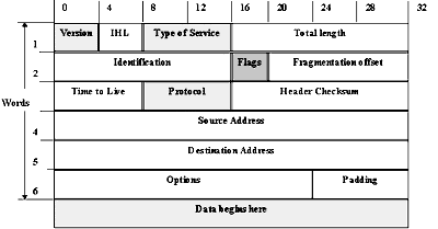 Рисунок1.7 Фактически, в этом заголовке определены все основные данные, необходимые для перечисленных выше функций протокола IP: адрес отправителя (4-ое слово заголовка), адрес получателя (5-ое слово заголовка), общая длина пакета (поле Total Lenght) и тип пересылаемой датаграммы (поле Protocol). Используя данные заголовка, машина может определить на какой сетевой интерфейс отправлять пакет. Если IP-адрес получателя принадлежит одной из ее сетей, то на интерфейс этой сети пакет и будет отправлен, в противном случае пакет отправят на другой шлюз. Если пакет слишком долго "бродит" по сети, то очередной шлюз может отправить ICMP-пакет на машину-отправитель для того, чтобы уведомить о том, что надо использовать другой шлюз. При этом, сам IP-пакет будет уничтожен. На этом принципе работает программа ping, которая используется для деления маршрутов прохождения пакетов по сети. Зная протокол транспортного уровня, IP-модуль производит раскапсулирование информации из своего пакета и ее направление на модуль обслуживания соответствующего транспорта. При обсуждении формата заголовка пакета IP вернемся еще раз к инкапсулированию. Как уже отмечалось, при обычной процедуре инкапсулирования пакет просто помещается в поле данных фрейма, а в случае, когда это не может быть осуществлено, то разбивается на более мелкие фрагменты. Размер максимально возможного фрейма, который передается по сети, определяется величиной MTU (Maximum Transsion Unit), определенной для протокола канального уровня. Для того, чтобы потом восстановить пакет IP должен держать информацию о своем разбиении. Для этой цели используется поля "flags" и "fragmentation offset". В этих полях определяется, какая часть пакета получена в данном фрейме, если этот пакет был фрагментирован на более мелкие части. Обсуждая