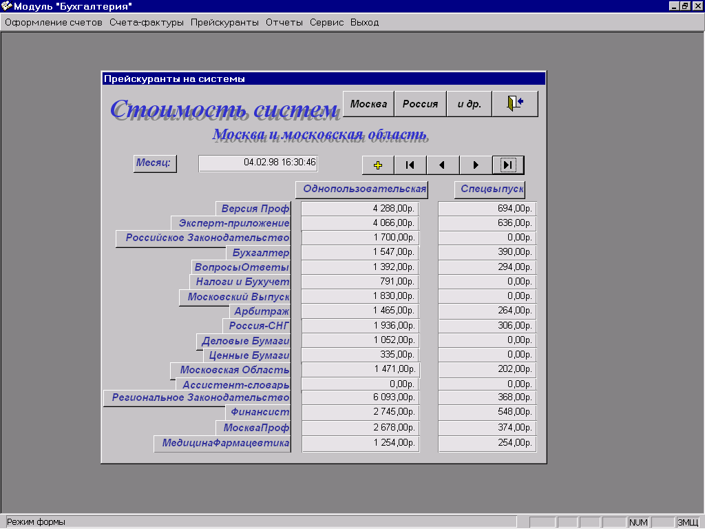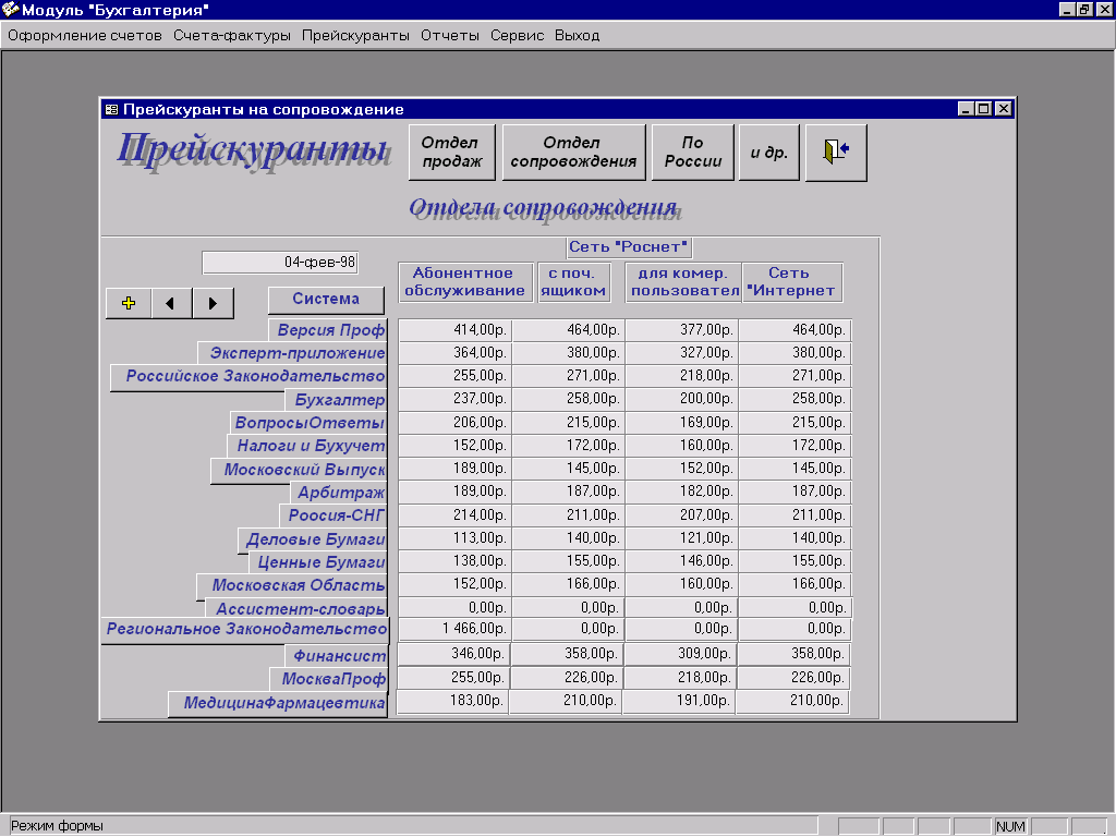 - список. Заполнение: по SQL - запросу. Источник строк: SQL - запрос по таблице «НаВыпискуСчета». (SELECT DISTINCTROW [НаВыпискуСчета].[Код], [НаВыпискуСчета].[Система], [НаВыпискуСчета].[Количество] FROM [НаВыпискуСчета];) Примечание: так как данное поле имеет источник строк SQL - запрос по временной таблице, то отображение изменений для данного поля происходит после обновления данных в форме (DoCmd Refresh). б) Кнопки. (для кнопок процедуры обработки событий вызываются по событию «Нажатие кнопки») 1) «Кнопка63» (Добавить новую >- при выписке в счете нового заказа). Назначение: занесение информации для данного заказа счета-фактуры во временную таблицу «НаВыпискуСчета» с проверкой на наличие правильности заполнения критических значений полей, обновление содержимого формы, с целью отображения последних изменений (в списке «СистемыНаВыписку») и переход на новую запись в текущей форме (для ввода нового счета-фактуры). Процедура обработки событий (листинг 3.55). Примечания: - . 2) «Кнопка69» (Добавить >). Назначение: занесение информации для данного заказа счета-фактуры во временную таблицу «НаВыпискуСчета» с проверкой на наличие правильности заполнения критических значений полей, обновление содержимого формы, с целью отображения последних изменений (в списке «СистемыНаВыписку») и переход на следующую запись в текущей форме (для ввода или изменения следующего заказа счета-фактуры). Процедура обработки событий (листинг 3.56). Примечания: - . 3) «Кнопка71», «Кнопка72», «Кнопка73», «Кнопка75». Назначение: для перехода по записям для текущей формы (счета -фактуры для данной организации). Реализация с помощью мастера. 4) «Кнопка70». Назначение: для удаления выделенной записи в списке «СистемыНаВыписку» из временной таблицы «НаВыпискуСчета» с проверкой на наличие выделенной записи, обновление содержимого формы, с целью отображения последних изменений (в списке «СистемыНаВыписку»). Процедура обработки событий (листинг 3.57). Примечания: - . 5) «Кнопка74». Назначение: для удаления всех записей в списке «СистемыНаВыписку» из временной таблицы «НаВыпискуСчета», обновление содержимого формы, с целью отображения последних изменений (в списке «СистемыНаВыписку»). Процедура обработки событий (листинг 3.58). Примечания: - . 6. Ввод прейскурантов на сопровождение и на системы. В соответствии со структурой распределения цен на системы по регионам была разработана структура взаимодействия пяти форм: 1. «Прейскурант» - основная. (свободная форма) 2. «ПрейскурантОС» - подчиненная1 (к основной) (источник записей таблица «ПрейскурантОС»). 3. «ПрейскурантОП» - подчиненная2 (к основной) (источник записей таблица «ПрейскурантОП»). 4. «Прейскурант_Север» - подчиненная3 (к основной) (источник записей таблица «Прейскурант_Север»). 5. «Прейскурант_Россия» - подчиненная4 (к основной) (источник записей таблица «Прейскурант_Россия»). Форма «Прейскурант».