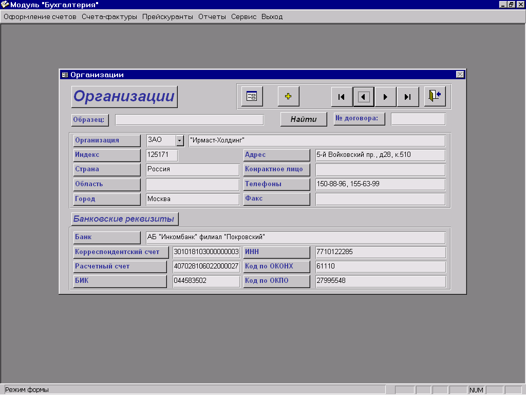 Основные поля: «адрес», «индекс», «телефон», «факс», «руководитель».
