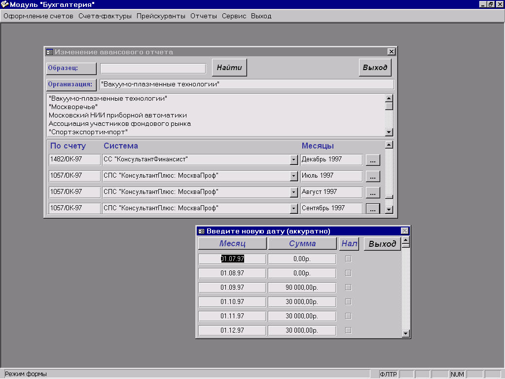 а) Поля 1) «Образец» Назначение: свободное поле для ввода текстовой и цифровой информации использующейся для поиска по названию организации в процедуре обработки события кнопки «Кнопка24»(Найти). Вводимое значение: текстовое или цифровое. 2) «Организация» Назначение: для отображения названия текущей организации. Источник записей: аналогичное поле в исходной таблице. 3) «Список13» - список. Назначение: свободное поле для поиска организации и перехода на требуемую запись. Источник записей: SQL - запрос по таблице «Заказчики». Примечания: сформирован с помощью мастера. б) Кнопки 1) «Кнопка24»(Найти). Назначение: для поиска и вывода информации по организации по текстовому образцу введенному в поле «Образец». Процедура обработки событий (листинг 3.67). Примечания:. 2) «КнопкаЗакрытьФорму» (Настройки счета). Назначение: для закрытия текущей формы. Примечания: реализация с помощью мастера. Форма «SubИзменениеАавнсОтчета» - ленточная форма а) Поля 1) «ПоСчету» Назначение: для отображения номера счета по которому было выписано сопровождение для текущей организации. Источник записей: аналогичное поле в исходной таблице. 2) «КодСистемы» Назначение: для отображения названия системы, на которую было выписано сопровождение для текущей организации. Источник записей: аналогичное поле в исходной таблице. 3) «ДатаНМС» - скрытое поле Назначение: для хранения даты начального месяца сопровождения по данному счету. Источник записей: аналогичное поле в исходной таблице. 4) «Поле2» - скрытое поле Назначение: для хранения даты последнего месяца сопровождения по данному счету. Источник записей: аналогичное поле в исходной таблице. 5) «ИдентКод» - скрытое поле Назначение: для хранения уникального кода записи в авансовом отчете. Значение используется, как значение фильтра при вызове диалогового окна «ИзменАавнсОтчТАБЛ». Источник записей: аналогичное поле в исходной таблице. 6) «Поле4» Назначение: для отображения даты первого месяца сопровождения по данному счету. Источник записей: =Format([ДатаHMC];"mmmm yyyy"). 7) «ДатаПМС» Назначение: для отображения даты последнего месяца сопровождения по данному счету. Источник записей: =Format([Поле2];"mmmm yyyy") б) Кнопки 1) «Кнопка14» (...). Назначение: для вызова диалогового окна «ИзменАавнсОтчТАБЛ», с применением фильтра по соответствующему значению в поле «ИдентКод» (листинг 3.68). Примечания: реализация с помощью мастера. Форма «ИзменАавнсОтчТАБЛ» - ленточная форма а) Поля 1) «Месяц» Назначение: для отображения месяца авансового отчета. Источник записей: аналогичное поле в исходной таблице. 2) «Сумма» Назначение: для отображения суммы по соответствующему месяцу авансового отчета. Источник записей: аналогичное поле в исходной таблице. 3) «ИдентКод» - скрытое поле Назначение: для хранения уникального кода записи по авансовому отчету. Значение по которому используется фильтр при вызове диалогового окна «ИзменАавнсОтчТАБЛ». Источник записей: аналогичное поле в исходной таблице. б) Кнопки 1) «Кнопка8» (Выход). Назначение: для закрытия текущей формы. Примечания: реализация с помощью мастера. Комментарии. Описанная структура имеет следующие особенности работы 1. Для формы Основная по событию «Текущая запись» в процедуре обработки событий происходит заполнение временной таблицы «Изменение АвансОтчета» и обновление формы, с целью отображения последн