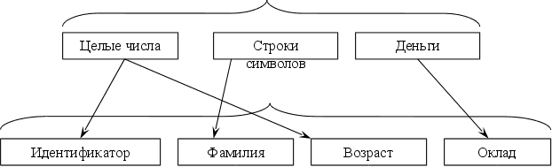 Таблица. Таблица – это некоторая регулярная структура, состоящая из конечного набора однотипных записей. Каждая запись одной таблицы состоит из конечного числа полей, причем конкретное поле каждой записи одной таблицы может содержать данные только одного типа. Значение данных. Значение данных представляет собой действительные данные, содержащиеся в каждом элементе данных. В зависимости от того, как элементы данных описывают объект, их значения могут быть количественными, качественными или описательными. Информацию о некоторой предметной области можно представить с помощью нескольких объектов, каждый из которых описывается несколькими элементами данных. Принимаемые элементами данных значения называются данными. Единичный набор принимаемых элементами данных значений называется экземпляром объекта. Объекты связываются между собой определенным образом. Соответствующая модель объектов с составляющими их элементами данных и взаимосвязями называется концептуальной моделью. Концептуальная модель дает общее представление о потоке данных в предметной области. Некоторые элементы данных обладают важным для построения информационной модели свойством. Если известно значение, которое принимает такой элемент данных объекта, мы можем идентифицировать значения, которые принимают другие элементы данных этого же объекта. Ключевой элемент данных. Ключевым элементом данных называется такой элемент, по которому можно определить значения других элементов данных. Однозначно идентифицировать объект могут два и более элемента данных. В этом случае их называют «кандидатами» в ключевые элементы данных. Вопрос о том, какой из кандидатов использовать для доступа к объекту, решается разработчиком системы. Выбирать ключевые элементы данных следует тщательно, поскольку правильный выбор способствует созданию достоверной концептуальной модели данных. Первичный ключ. Первичные ключ – это атрибут (или группа атрибутов), которые единственным образом идентифицируют каждую строку в таблице. Понятие первичного ключа является исключительно важным в связи с понятием целостности баз данных. Альтернативный ключ. Альтернативный ключ – это атрибут (или группа атрибутов), несовпадающий с первичным ключом и уникально идентифицирующий экземпляр объекта. Например для объекта «служащий», который имеет атрибуты «ИДЕНТИФИКАТОР», «ФАМИЛИЯ», «ИМЯ», «ОТЧЕСТВО», группа атрибутов «ФАМИЛИЯ», «ИМЯ», «ОТЧЕСТВО» может являться альтернативным ключом по отношению к атрибуту «ИДЕНТИФИКАТОР». Запись данных. Запись данных – это совокупность значений связанных элементов данных. Записи хранятся на некотором носителе, в качестве которого может выступать человеческий мозг, лист бумаги, память ЭВМ, внешнее запоминающее устройство и т.д. Тип данных. Тип данных характеризует вид хранящихся данных. В современных базах данных допускается хранение символьных, числовых данных, битовых строк, специализированных числовых данных (например, суммы в денежных единицах), а также данных специального формата (дата, время, временной интервал и т.д.). В любом случае при выборе типа данных необходимо учитывать возможности системы управления базами данных (СУБД), с помощью которой реализуется физическая модель информационной системы. Домен. Доменом называется набор знач
