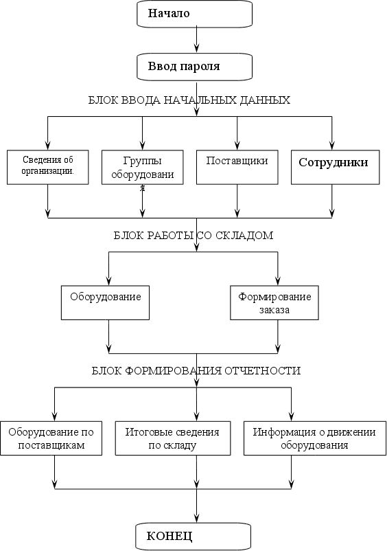 Данная программа разработана для склада ГУ ГОЧС г. Москвы, однако может применяться и на складах ГУ ГОЧС по всей территории РФ. Использование средств вычислительной техники и современного программного обеспечения значительно повышают уровень работы складов ГУ ГОЧС и позволяют своевременно и оперативно работать в условиях чрезвычайных ситуаций. 5. Приложения. Приложение 1. Блок-схема работы программы.