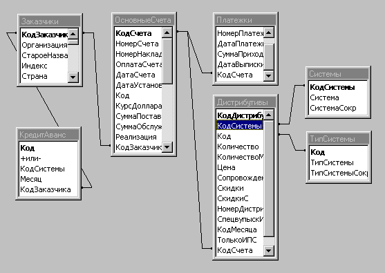 1.Связь таблицы «Заказчики» с таблицей «ОсновныеСчета». Поле: «КодЗаказчика» в обеих таблицах. Тип связи: один ко многим с обеспечением целостности данных с каскадным удалением и каскадным обновлением данных. (один со стороны таблицы «Заказчики») Связывание: мастер подстановок в таблице «ОсновныеСчета» Примечания: у каждого заказчика может быть много счетов. 2.Связь таблицы «Заказчики» с таблицей «КредитАванс». Поле: «КодЗаказчика» в обеих таблицах. Тип связи: один ко многим без обеспечения целостности данных. (один со стороны таблицы «Заказчики») (возможно связывание один к одному?) Связывание: мастер подстановок в таблице «КредитАванс» 3.Связь таблицы «Заказчики» с таблицей «СчетаФактуры». Поле: «КодЗаказчика» в обеих таблицах. Тип связи: один ко многим без обеспечения целостности данных. (один со стороны таблицы «Заказчики») Связывание: мастер подстановок в таблице «СчетаФактуры» Примечания: у каждого заказчика может быть много счетов-фактур. 4. Связь таблицы «ОсновныеСчета» с таблицей «Дистрибутивы». Поле: «КодСчета» в обеих таблицах. Тип связи: один ко многим с обеспечением целостности данных с каскадным удалением и каскадным обновлением данных. (один со стороны таблицы «ОсновныеСчета») Связывание: мастер подстановок в таблице «Дистрибутивы» Примечания: в каждый счет может входить много записей по заказам. 5. Связь таблицы «ОсновныеСчета» с таблицей «Платежки». Поле: «КодСчета» в обеих таблицах. Тип связи: один ко многим с обеспечением целостности данных с каскадным удалением и каскадным обновлением данных. (один со стороны таблицы «ОсновныеСчета») Связывание: мастер подстановок в таблице «Дистрибутивы» Примечания: в каждому счету может относится несколько платежных поручений. (*Если платежное поручение оплачивает несколько счетов, то при внесении данных к счетам пишется одно и тоже платежное поручение, но суммы вносятся в соответствии с суммой счета) 6. Связь таблицы «ОсновныеСчета» с таблицей «СчетаФактурыОсновные». Поле: «КодСчета» в обеих таблицах. Тип связи: один ко многим с обеспечением целостности данных с каскадным удалением и каскадным обновлением данных. (один со стороны таблицы «ОсновныеСчета») Связывание: мастер подстановок в таблице «Дистрибутивы» Примечания: в каждому счету может относится несколько счетов-фактур на системы. 7. Связь таблицы «Дистрибутивы» с таблицей «Системы». Поле: «КодСистемы». Тип связи: один ко многим без обеспечения целостности данных. (один со стороны таблицы «Системы») Связывание: мастер подстановок в таблице «Дистрибутивы» Примечания: данная связь заменяет повторяющееся текстовые значения названия систем соответствующим кодом из таблицы «Системы». 8. Связь таблицы «Дистрибутивы» с таблицей «ТипСистемы». Поле: «Код» в обеих таблицах. Тип связи: один ко многим без обеспечения целостности данных. (один со стороны таблицы «ТипСистемы») Связывание: мастер подстановок в таблице «Дистрибутивы» Примечания: данная связь заменяет повторяющееся текстовые значения типа систем соответствующим кодом из таблицы «ТипСистемы». 9. Связь таблицы «ОсновныеСчета» с таблицей «ФормаОплаты». Поле: «Код» в обеих таблицах. Тип связи: один ко многим без обеспечения целостности данных. (один со стороны таблицы «ФормаОплаты») Связывание: мастер подстановок в таблице «ОсновныеСчета» Примеча
