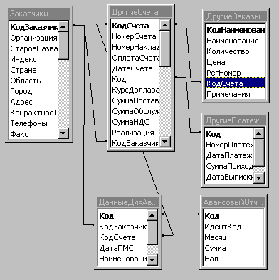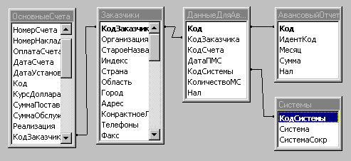 1. Связь таблицы «Заказчики» с таблицей «АвансПоОстаткамС1996Года». Поле: «КодЗаказчика» в таблице «Заказчики» с полем «Заказчик» в таблице «АвансПоОстаткамС1996Года». Тип связи: один ко многим с обеспечением целостности данных. (один со стороны таблицы «Заказчики») Связывание: в окне схемы данных. Примечания: к каждому заказчику может относится несколько записей по месяцам по авансовому отчету. 2. Связь таблицы «Заказчики» с таблицей «ДанныеДляАвансОтчета». Поле: «КодЗаказчика» в обеих таблицах. Тип связи: один ко многим без обеспечения целостности данных. (один со стороны таблицы «Заказчики») Связывание: мастер подстановок в таблице «ДанныеДляАвансОтчета» Примечания: для данной организации данных к каждому заказчику может относится несколько записей по авансовому отчету. 3. Связь таблицы «Системы» с таблицей «ДанныеДляАвансОтчета». Поле: «КодСистемы» в обеих таблицах. Тип связи: один ко многим без обеспечения целостности данных. (один со стороны таблицы «Заказчики») Связывание: мастер подстановок в таблице «ДанныеДляАвансОтчета» Примечания: данная связь заменяет повторяющееся текстовые значения названия системы соответствующим кодом из таблицы «Системы». 4. Связь таблицы «ОсновныеСчета» с таблицей «ДанныеДляАвансОтчета». Поле: «КодСчета» в обеих таблицах. Тип связи: один ко многим без обеспечения целостности данных. (один со стороны таблицы «ОсновныеСчета») Связывание: мастер подстановок в таблице «ДанныеДляАвансОтчета» Примечания: к каждому счета может относится несколько записей по авансовому отчету. 5. Связь таблицы «ДанныеДляАвансОтчета» с таблицей «АвансовыйОтчет». Поле: «Код» в таблице «ДанныеДляАвансОтчета» с полем «ИдентКод» в таблице «АвансовыйОтчет». Тип связи: один ко многим с обеспечения целостности данных с каскадным удалением и каскадным обновлением данных. (один со стороны таблицы «ДанныеДляАвансОтчета») Связывание: в окне схемы данных. Часть 4. (листинг 2.4) (таблицы «Заказчики», «ДругиеСчета», «ДругиеПлатежки», «ДругиеЗаказы», «ДанныеДляАвансОтчетаДр», «АвансовыйОтчетДр».)