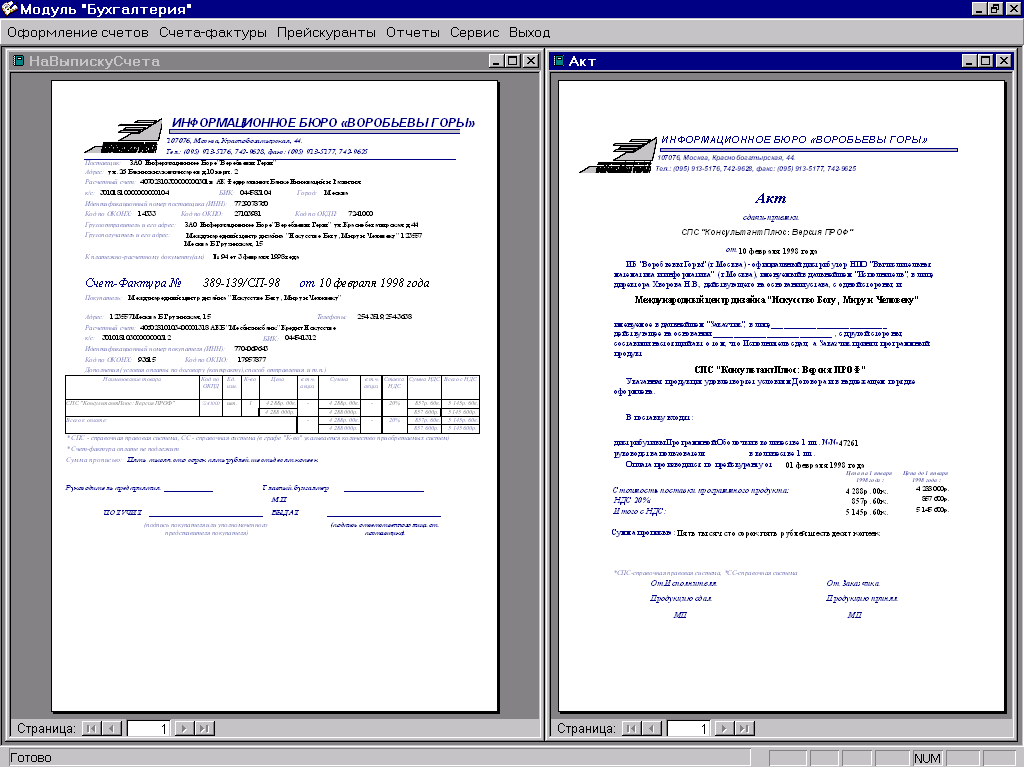 Данные отчеты реализованы с помощью конструктора отчетов. Источниками данных для отчетов служат соответствующие временные таблицы, заполняемые данными при выписке счетов, актов, накладных и т.д. Общим для всех отчетов является ссылки на соответствующие поля в формах для выписки документов. Для всех типов счетов, по событию форматирование области заголовка отчета, по процедуре обработки события, изменяется свойство «Visible» для подчиненного отчета и в соответствии со значениями глобальной переменной ВалДляСчета, на печать выводятся реквизиты организации для перевода денежных средств на счета в разных банках («Федеральный Банк Инноваций и Развития», «Валютное управление СБ РФ»).