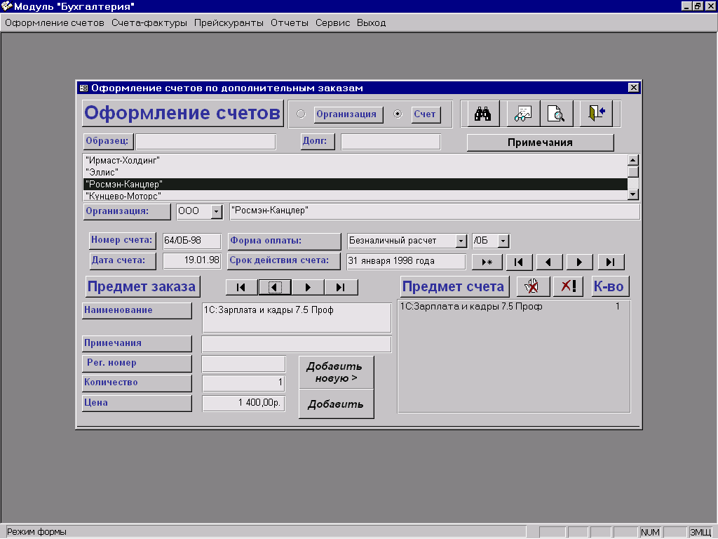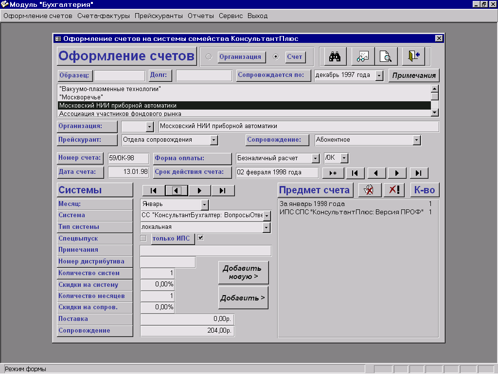 Для обеспечения функциональной универсальности базы данных реализован ряд функций общего назначения. Данные функции применяются в ряде форм и отчетов, и выполняю как сервисные функции, так и функции обработки данных. Например, функция «Number» применяется практически во всех формах отчетности для перевода суммы из числового выражения в буквенное. Функции сохранены в модулях базы данных и вызываются динамически по запросу из процедур обработки событий. В листинге 4.1 приведены исходные тексты всех модулей используемых в базе данных. 3.5.4. Описание структуры программы. Учитывая сформированную иерархическую структуру данных и очередность реализации проекта процесс технической реализации состоял из следующих этапов. 1. Оформление, учет и выписка первичной бухгалтерской документации (счетов) по основному профилю работы организации (системы КонсультантПлюс) Для реализации данного этапа была разработана структура взаимодействия трех форм: 1. «ОсновнаяОформлениеСчетов» - основная (источник записей таблица «Заказчики»). 2. «ОсновныеСчета:Подчиненая» - подчиненная1 (к основной) (источник записей таблица «СчетаОсновные»). 3. «Дистрибутивы1» - подчиненная1.1 (к подчиненной1) (источник записей таблица «Дистрибутивы»). Форма «ОсновнаяОформлениеСчетов». а) Поля.