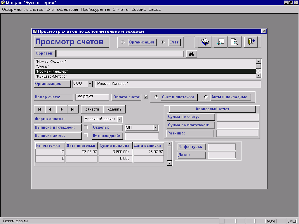а) Поля. 1) «Образец» Назначение: для ввода текстовой и цифровой информации использующейся для поиска по названию организации в процедуре обработки события кнопки «Кнопка165»(Найти). Вводимое значение: текстовое или цифровое. 2) «Код» (поле со списком) Назначение: для отображения и выбора типа статуса текущей организации. Заполнение: выбор из списка. Источник записей: аналогичное поле в исходной таблице. 3) «Организация» Назначение: для отображения названия текущей организации. Источник записей: аналогичное поле в исходной таблице. 4) «Список116»(Список) Назначение: свободное поле для поиска организации и перехода на требуемую запись. Источник записей: SQL - запрос по таблице «Заказчики». Примечания: сформирован с помощью мастера. 5) Остальные поля «Индекс», «Страна» и т.д. предназначены для отображения ввода и изменения адресных и банковских реквизитов текущей организации. Назначение: для отображения типа сопровождения по которому производится расчет для текущей организации. Источники записей: аналогичные поля в исходной таблице. 6) «ПервыйМесяц» Назначение: свободное поле для ввода первого месяца сопровождения начиная с которого необходимо выписывать акты и счета-фактуры на сопровождение для текущей организации. Примечания: вводимое значение в кратком формате даты (например 04.03.97) используется только для формирования начальной даты при выписке акты и счета-фактуры на сопровождение для текущей организации. б) Кнопки. (для кнопок процедуры обработки событий вызываются по событию «Нажатие кнопки») 1) «Кнопка165»(Найти). Назначение: для поиска и вывода информации по организации по текстовому образцу введенному в поле «Образец». Процедура обработки событий (листинг 3.23). Примечания: задание флагу flagFind значения True (используется для отлавливания ошибки в «Отсутствие текущей записи», процедуре обработки события по событию «Текущая запись» для формы «Основная»). 2) «Кнопка139»(Настройки печати). Назначение: для вывода на экран диалогового окна «Настройки счета» (смотри пункт __). Примечания: реализация с помощью мастера. 3) «Кнопка174». Назначение: для предварительного просмотра образца актов, накладных и счетов-фактур по счету при продаже. Процедура обработки событий (листинг 3.24). Примечания: реализация с помощью мастера, проверка значений формы критических для выписки счета. 4) «КнопкаЗакрытьФорму» (Настройки счета). Назначение: для закрытия текущей формы. Примечания: реализация с помощью мастера. 5) «Кнопка181». Назначение: для предварительного просмотра образца актов и счетов-фактур на сопровождение по счету для текущей организации (листинг 3.25) Примечания: реализация с помощью мастера, проверка значений формы критических для выписки счета. Форма «ПросмотрSub». а) Поля. 1) «НомерСчета». Назначение: для отображения номера счета для текущей организации. Источник записей: аналогичное поле в исходной таблице. 2) «Код» (Форма оплаты). Назначение: для отображения и выбора формы оплаты данного счета. Заполнение: выбор из списка. Источник записей: аналогичное поле в исходной таблице. 3) «КодОтдела»(Отделы). Назначение: для отображения и выбора отдела который выписал данный счет.. Заполнение: выбор из списка. Источник записей: аналогичное поле в исходной таблице. 4) «НомерНакладной» ((№ Накладной). Назначение: для ввода и отображения номера накладной, пр