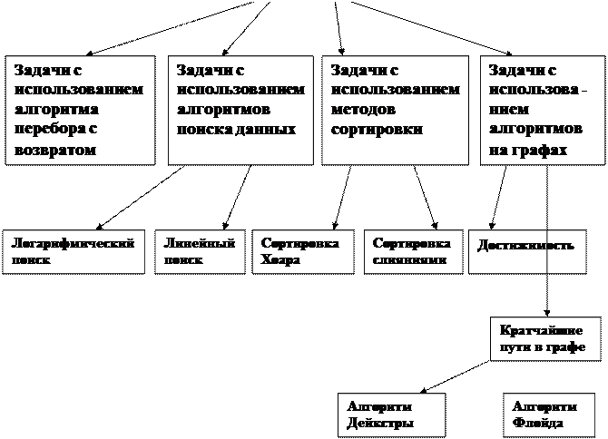 Время работы алгоритма пропорционально N2. Алгоритм Флойда (кратчайшие пути между всеми парами вершин).Дано. Ориентированный граф G=<V,E>, s - вершина источник; матрица смежности A (A:array[1..n,1..n] of integer); для любых u, v€V вес дуги неотрицательный (А[u,v]>=0). Результат. Матрица D кратчайших расстояний между всеми парами вершин графа и кратчайшие пути. Идея алгоритма. Обозначим через Dm[i,j] оценку кратчайшего пути из i в j с промежуточными вершинами из множества [1..m]. Тогда имеем: D0[i,j]:=A[i,j] и D(m+1)[i,j]=min{Dm[i,j],Dm[i,m+1]+Dm[m+1,j]}. Второе равенство требует пояснения. Пусть мы находим кратчайший путь из i в j с промежуточными вершинами из множества [1..(m+1)]. Если этот путь не содержит вершину (m+1), то D(m+1)[i,j]=Dm[i,j]. Если же он содержит эту вершину, то его можно разделить на две части от i до (m+1) до j. Время работы алгоритма пропорционально N3. Глава 2 Система задач и упражнений. Классификация задач.Набор задач, разработанный нами и изложенный ниже можно систематизировать по следующим критериям: