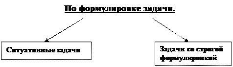Ситуативные задачи: это задачи, формулировка которых представляет собой ситуацию из жизни. Это необходимо для более наглядного представления задачи, а также для того, чтобы сделать задачу более интересной для решения. Задачи со строгой формулировкой: это задачи, в формулировке которой строго изложена суть задачи. Данные задачи являются задачами более низкого уровня, так как в них не требуется определения тематики задачи, а следовательно, и выбора способа решения, требуется лишь реализация алгоритма на языке программирования.