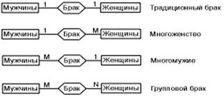 Квартира может пустовать, в ней может жить один или несколько жильцов. Так как между двумя сущностями возможны связи в обоих направлениях, то существует еще два типа связи МНОГИЕ-К-ОДНОМУ (М:1) и МНОГИЕ-КО-МНОГИМ (М:N). Пример. Если связь между сущностями МУЖЧИНЫ и ЖЕНЩИНЫ называется БРАК, то существует четыре возможныхпредставления такой связи: