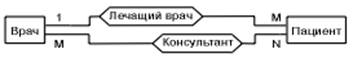 (пациент, имея одного лечащего врача, может иметь также несколько врачей-консультантов; врач может быть лечащим врачом нескольких пациентов и может одновременно консультировать несколько других пациентов); · тренарные связи