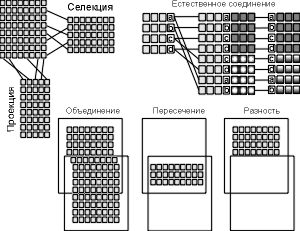 Рисунок 5. Некоторые операции реляционной алгебры Созданы языки манипулирования данными, позволяющие реализовать все операции реляционной алгебры и практически любые их сочетания. Среди них наиболее распространены SQL (Structured Query Language – структуризованный язык запросов) и QBE (Quere-By-Example – запросы по образцу) . Оба относятся к языкам очень высокого уровня, с помощью которых пользователь указывает, какие данные необходимо получить, не уточняя процедуру их получения. Заключение На сегодняшний день реляционные базы данных остаются самыми распространенными, благодаря своей простоте и наглядности как в процессе создания так и на пользовательском уровне. Основным достоинством реляционных баз данных совместимость с самым популярным языком запросов SQL. С помощью единственного запроса на этом языке можно соединить несколько таблиц во временную таблицу и вырезать из нее требуемые строки и столбцы (селекция и проекция). Так как табличная структура реляционной базы данных интуитивно понятна пользователям, то и язык SQL является простым и легким для изучения. Реляционная модель имеет солидный теоретический фундамент, на котором были основаны эволюция и реализация реляционных баз данных. На волне популярности, вызванной успехом реляционной модели, SQL стал основным языком для реляционных баз данных. В процессе анализа вышеизложенной информации выявлены следующие недостатки рассмотренной модели баз данных: - так как все поля одной таблицы должны содержать постоянное число полей заранее определенных типов, приходится создавать дополнительные таблицы, учитывающие индивидуальные особенности элементов, при помощи внешних ключей. Такой подход сильно усложняет создание сколько-нибудь сложных взаимосвязей в базе данных; - высокая трудоемкость манипулирования информацией и изменения связей. Литература 1. Дейт К. Руководство по реляционной СУБД DB2. - М.: Финансы и статистика, 1988. - 320 с. 2. Кириллов В.В. Основы проектирования реляционных баз данных .Учебное пособие. - СПб.: ИТМО, 1994. - 90 с. 3. Мейер М. Теория реляционных баз данных. -М.: Мир, 1987. - 608 с. 4. Ульман Дж. Базы данных на Паскале. -М.: Машиностроение, 1990. - 386 с. 5. http://www.citforum.ru/database/sql_kg/index.shtml “ Основы проектирования реляционных баз данных ” |