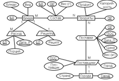 (врач может назначить несколько пациентов на несколько анализов, анализ может быть назначен несколькими врачами нескольким пациентам и пациент может быть назначен на несколько анализов несколькими врачами); · связи более высоких порядков, семантика (смысл) которых иногда очень сложна. 2.3 Классификация сущностейСуществуют три основные класса сущностей: стержневые, ассоциативные и характеристические, а также подкласс ассоциативных сущностей – обозначения. Стержневая сущность (стержень) – это независимая сущность (несколько подробнее она будет определена ниже). В рассмотренных ранее примерах стержни – это "Студент", "Квартира", "Мужчины", "Врач", "Брак" и другие, названия которых помещены в прямоугольники. Ассоциативная сущность (ассоциация) – это связь вида "многие-ко-многим" ("-ко-многим" и т.д.) между двумя или более сущностями или экземплярами сущности . Ассоциации рассматриваются как полноправные сущности: - они могут участвовать в других ассоциациях и обозначениях точно так же, как стержневые сущности; - могут обладать свойствами, т.е. иметь не только набор ключевых атрибутов, необходимых для указания связей, но и любое число других атрибутов, характеризующих связь. Характеристическая сущность (характеристика) – это связь вида "многие-к-одной" или "одна-к-одной" между двумя сущностями (частный случай ассоциации). Единственная цель характеристики в рамках рассматриваемой предметной области состоит в описании или уточнении некоторой другой сущности. Необходимость в них возникает в связи с тем, что сущности реального мира имеют иногда многозначные свойства. Муж может иметь несколько жен , книга – несколько характеристик переиздания (исправленное, дополненное, переработанное, ...) и т.д. Существование характеристики полностью зависит от характеризуемой сущности: женщины лишаются статуса жен, если умирает их муж. Обозначающая сущность или обозначение – это связь вида "многие-к-одной" или "одна-к-одной" между двумя сущностями и отличается от характеристики тем, что не зависит от обозначаемой сущности. В заключение рассмотрим пример построения инфологической модели базы данных "Питание", где должна храниться информация о блюдах, их ежедневном потреблении, продуктах, из которых приготавливаются эти блюда, и поставщиках этих продуктов. Информация будет использоваться поваром и руководителем небольшого предприятия общественного питания, а также его посетителями. С помощью указанных пользователей выделены следующие объекты и характеристики проектируемой базы: 1. Блюда, для описания которых нужны данные, входящие в их кулинарные рецепты: номер блюда (например, из книги кулинарных рецептов), название блюда, вид блюда (закуска, суп, горячее и т.п.), рецепт (технология приготовления блюда), выход (вес порции), название, калорийность и вес каждого продукта, входящего в блюдо. 2. Для каждого поставщика продуктов: наименование, адрес, название поставляемого продукта, дата поставки и цена на момент поставки. 3. Ежедневное потребление блюд (расход): блюдо, количество порций, дата. Анализ объектов позволяет выделить: · стержни Блюда, Продукты и Города; · ассоциации Состав (связывает Блюда с Продуктами) и Поставки (связывает Поставщиков с Продуктами); · обозначение Поставщики; · характеристики Рецепты и Расход.