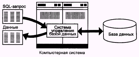 S Рис. 2.1. Применение SQL для доступа к базе данных QL является инструментом, предназначенным для обработки и чтения данных, содержащихся в компьютерной базе данных. SQL - это сокращенное название структурированного языка запросов (Structured Query Language). Как следует из названия, SQL является языком программирования, который применяется для организации взаимодействия пользователя с базой данных. На самом деле SQL работает только с базами данных одного определенного типа, называемых реляционными. На рис. 2.1 изображена схема работы SQL. Согласно этой схеме, в вычислительной системе имеется база данных, в которой хранится важная информация. Если вычислительная система относится к сфере бизнеса, то в базе данных может храниться информация о материальных ценностях, выпускаемой продукции, объемах продаж и зарплате. В базе данных на персональном компьютере может храниться информация о выписанных чеках, телефонах и адресах или информация, извлеченная из более крупной вычислительной системы. Компьютерная программа, которая управляет базой данных, называется системой управления базой данных, или СУБД.Если пользователю необходимо прочитать данные из базы данных, он запрашивает их у СУБД с помощью SQL. СУБД обрабатывает запрос, находит требуемые данные и посылает их пользователю. Процесс запрашивания данных и получения результата называется запросом к базе данных: отсюда и название — структурированный язык запросов. Однако это название не совсем соответствует действительности. Во-первых, сегодня SQL представляет собой нечто гораздо большее, чем простой инструмент создания запросов, хотя именно для этого он и был первоначально предназначен. Несмотря на то, что чтение данных по-прежнему остается одной из наиболее важных функций SQL, сейчас этот язык используется для реализации всех функциональных возможностей, которые СУБД предоставляет пользователю, а именно: