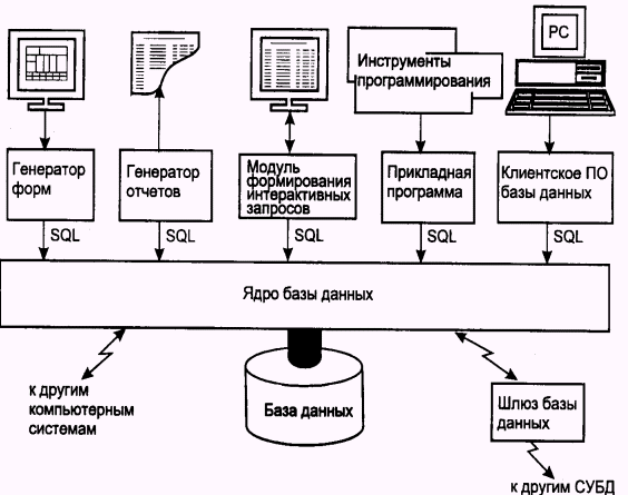 Таким образом, SQL является достаточно мощным языком для взаимодействия с СУБД. Во-вторых, SQL — это не полноценный компьютерный язык типа COBOL, FORTRAN или С. В SQL нет оператора IF для проверки условий, нет оператора GOTO для организации переходов и нет операторов DO или FOR для создания циклов. SQL является подъязыком баз данных, в который входит около тридцати операторов, предназначенных для управления базами данных. Операторы SQL встраиваются в базовый язык, например COBOL, FORTRAN или С, и дают возможность получать доступ к базам данных. Кроме того, из такого языка, как С, операторы SQL можно посылать СУБД в явном виде, используя интерфейс вызовов функций. Наконец, SQL — это слабо структурированный язык, особенно по сравнению с такими сильно структурированными языками, как С или Pascal. Операторы SQL напоминают английские предложения и содержат "слова-пустышки", не влияющие на смысл оператора, но облегчающие его чтение. В SQL почти нет нелогичностей, к тому же имеется ряд специальных правил, предотвращающих создание операторов SQL, которые выглядят как абсолютно правильные, но не имеют смысла. Несмотря на не совсем точное название, SQL на сегодняшний день является единственным стандартным языком для работы с реляционными базами данных. SQL — это достаточно мощный и в то же время относительно легкий для изучения язык. Роль SQL Сам по себе SQL не является ни системой управления базами данных, ни отдельным программным продуктом. Нельзя пойти в компьютерный магазин и "купить SQL". SQL — это неотъемлемая часть СУБД, инструмент, с помощью которого осуществляется связь пользователя с ней. На рис. 2.2. изображена структурная схема типичной СУБД, компоненты которой соединяются в единое целое с помощью SQL (своего рода "клея"). Ядро базы данных является сердцевиной СУБД; оно отвечает за физическое структурирование и запись данных на диск, а также за физическое чтение данных с диска. Кроме того, оно принимает SQL-запросы от других компонентов СУБД (таких как генератор форм, генератор отчетов или модуль формирования интерактивных запросов), от пользовательских приложений и даже от других вычислительных систем. Как видно из рисунка, SQL выполняет много различных функций: