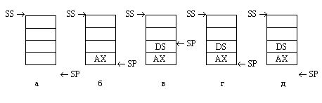 Рис 4. Организация стека: а - исходное состояние, б - после загрузки одного элемента (в данном примере - содержимого регистра АХ), в - после загрузки второго элемента (содержимого регистра DS), г - после выгрузки одного элемента, д - после выгрузки двух элементов и возврата в исходное состояние. Загрузка в стек осуществляется специальной командой работы со стеком push (протолкнуть). Эта команда сначала уменьшает на 2 содержимое указателя стека, а затем помещает операнд по адресу в SP. Если, например, мы хотим временно сохранить в стеке содержимое регистра АХ, следует выполнить команду push АХ Стек переходит в состояние, показанное на рис. 1.10, б. Видно, что указатель стека смещается на два байта вверх (в сторону меньших адресов) и по этому адресу записывается указанный в команде проталкивания операнд. Следующая команда загрузки в стек, например, push DS переведет стек в состояние, показанное на рис. 1.10, в. В стеке будут теперь храниться два элемента, причем доступным будет только верхний, на который указывает указатель стека SP. Если спустя какое-то время нам понадобилось восстановить исходное содержимое сохраненных в стеке регистров, мы должны выполнить команды выгрузки из стека pop (вытолкнуть): pop DS Какого размера должен быть стек? Это зависит от того, насколько интенсивно он используется в программе. Если, например, планируется хранить в стеке массив объемом 10 000 байт, то стек должен быть не меньше этого размера. При этом надо иметь в виду, что в ряде случаев стек автоматически используется системой, в частности, при выполнении команды прерывания int 21h. По этой команде сначала процессор помещает в стек адрес возврата, а затем DOS отправляет туда же содержимое регистров и другую информацию, относящуюся к прерванной программе. Поэтому, даже если программа совсем не использует стек, он все же должен присутствовать в программе и иметь размер не менее нескольких десятков слов. В нашем первом примере мы отвели под стек 128 слов, что безусловно достаточно. Структура программы на ассемблереПрограмма на ассемблере представляет собой совокупность блоков памяти, называемых сегментами памяти. Программа может состоять из одного или нескольких таких блоков-сегментов. Каждый сегмент содержит совокупность предложений языка, каждое из которых занимает отдельную строку кода программы. Предложения ассемблера бывают четырех типов: