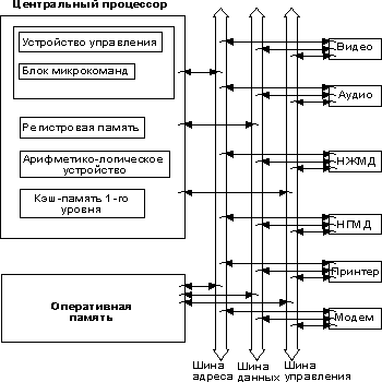 стиле. Человек создавая компьютер где то в глубине себя думал что создает что то похожее на себя самого. У компьютера есть органы восприятия информации из внешнего мира — это клавиатура, мышь, накопители на магнитных дисках. На рис. 2 эти органы расположены справа от системных шин. У компьютера есть органы “переваривающие” полученную информацию — это центральный процессор и оперативная память. И, наконец, у компьютера есть органы речи, выдающие результаты переработки. Это также некоторые из устройств справа. Современным компьютерам, конечно, далеко до человека. Их можно сравнить