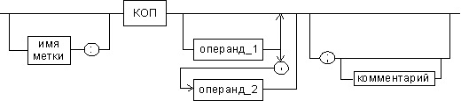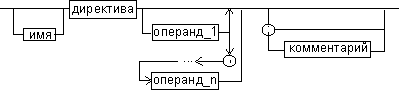 Синтаксис ассемблераПредложения, составляющие программу, могут представлять собой синтаксическую конструкцию, соответствующую команде, макрокоманде, директиве или комментарию. Для того чтобы транслятор ассемблера мог распознать их, они должны формироваться по определенным синтаксическим правилам. Для этого лучше всего использовать формальное описание синтаксиса языка наподобие правил грамматики. Наиболее распространенные способы подобного описания языка программирования — синтаксические диаграммы и расширенные формы Бэкуса—Наура. Для практического использования более удобны синтаксические диаграммы. К примеру, синтаксис предложений ассемблера можно описать с помощью синтаксических диаграмм, показанных на следующих рисунках.