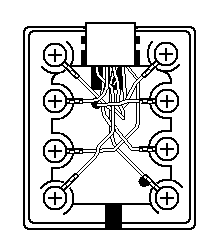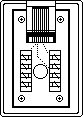 Вид без крышки. Розетка Cat. 5 Тип KRONE. Здесь используется пластина с щелью. Заталкивая провод в щель, вы прорезаете изоляцию и жила кабеля входит в контакт с пластиной. Пластина повернута на 45 градусов. Для монтажа проводов продается специальный инструмент, который помимо заталкивания проводов в щель, обрезает лишнее. |