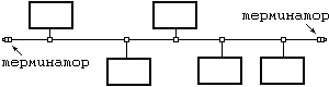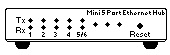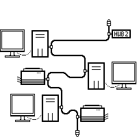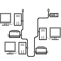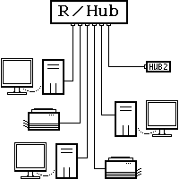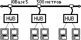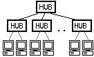 Для расширения сети, хабы могут каскадно соединяться друг с другом, образуя древовидную топологию, с единственным хабом в вершине. Максимальное количество пользователей - 1024. |