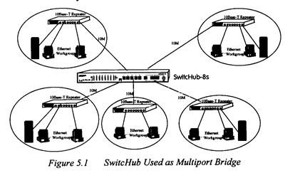 Глава 5 : Применение SwitchHub предназначен для обеспечения гибкости при конфигурировании сетевых соединений. SwitchHub может быть использован как простой автономный переключаемый концентратор, или соединяться со стандартными повторительными концентраторами или переключаемыми концентраторами используя различные конфигурации. Некоторые из более распространенных применений SwitchHub изложены в этой главе. Многопортовый мост