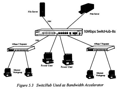 Большинство сетей взаимосвязаны с традиционными 2-портовыми мостами, которые вносят некоторое замедление в нормальное взаимодействие. Для движения которое должно проходить через несколько мостов чтобы достичь приемника это время ожидания может значительно понизить связь. Имея 8 параллельных соединительных портов SwitchHub может сократить большой сетевой комплекс до одного эффективного узла, увеличивая производительность. Сегменты подсоединенные к SwitchHub, больше не должны пересекать базовую сеть. Таким образом достигается почти нулевое время ожидания.