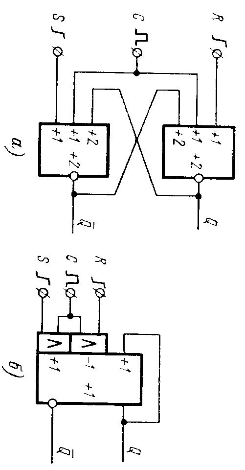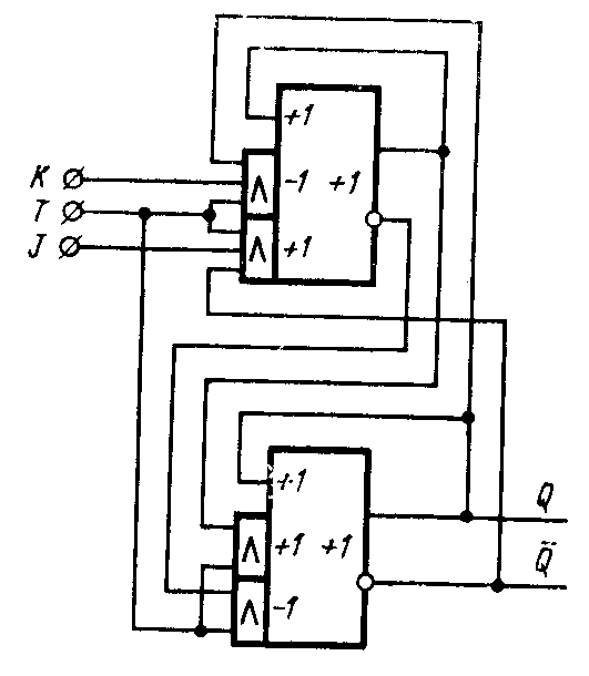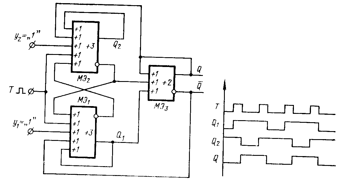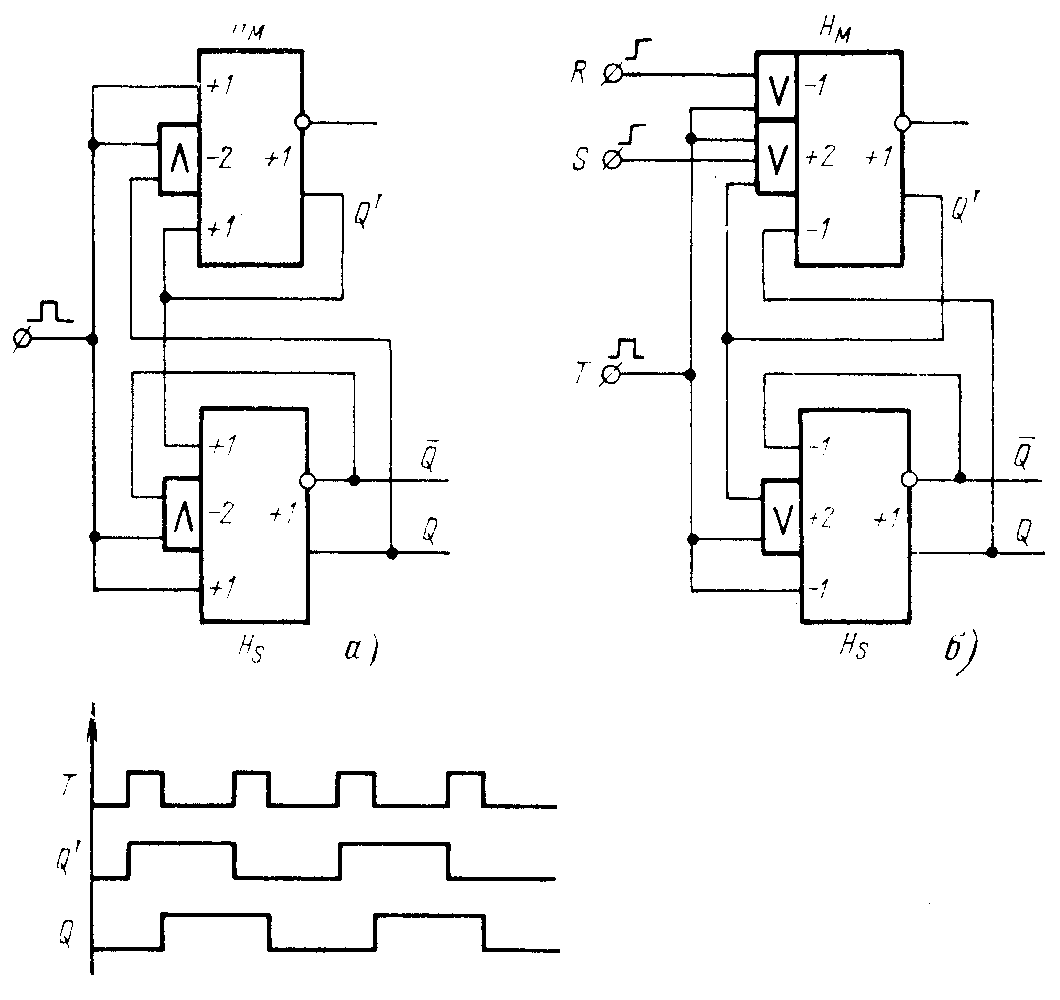 подавать сигнал Рассмотрим триггеры со счётными входами, или так называемые Т-триггеры. В простейшем случае Т-триггер можно построить на двух RS-триггерах типа рисунка 2-2а, с добавлением некоторых входов или вентилей, как это делается обычно при построении Т-триггера на булевых элементах. Однако при этом потребуются 4-6 элементов, то есть схема получается сложной. На