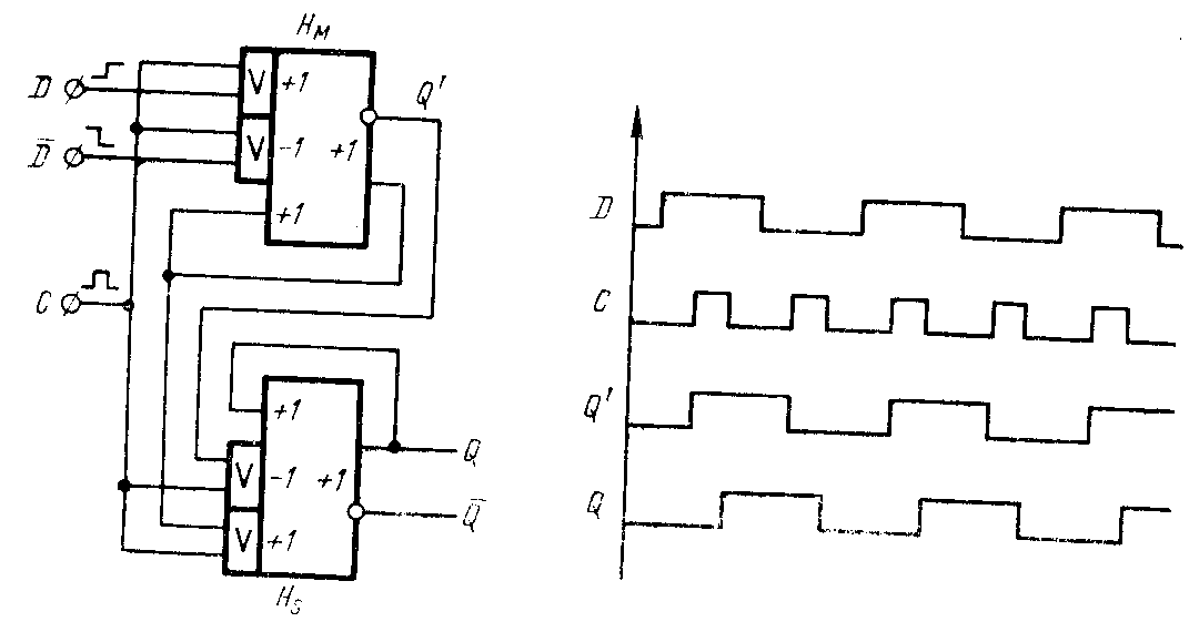 Рис. 2-6. D-триггер типа MS с парафазным входом На рисунке 2-6 показан ведущий-ведомый (Master-Slave) D-триггер (далее будем называть MSD-триггером) с пара фазным входом и временная диаграмма его работы. При поступлении синхроимпульса его положительный перепад записывает информацию D в ведущем нейроне Нм, при этом состояние ведомого нейрона остаётся прежним. Отрицательный перепад синхроимпульса, состояние ведущего нейрона записывает в ведомом нейроне Нs. Как видно, информация на выходе этого триггера появляется с задержкой, равной длительности синхроимпульса. Поэтому этот триггер иногда называют также задержанным D-триггером в отличие от простого D-триггера. Как
