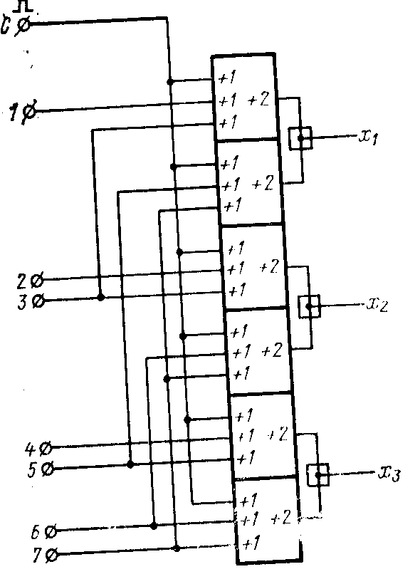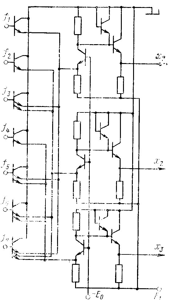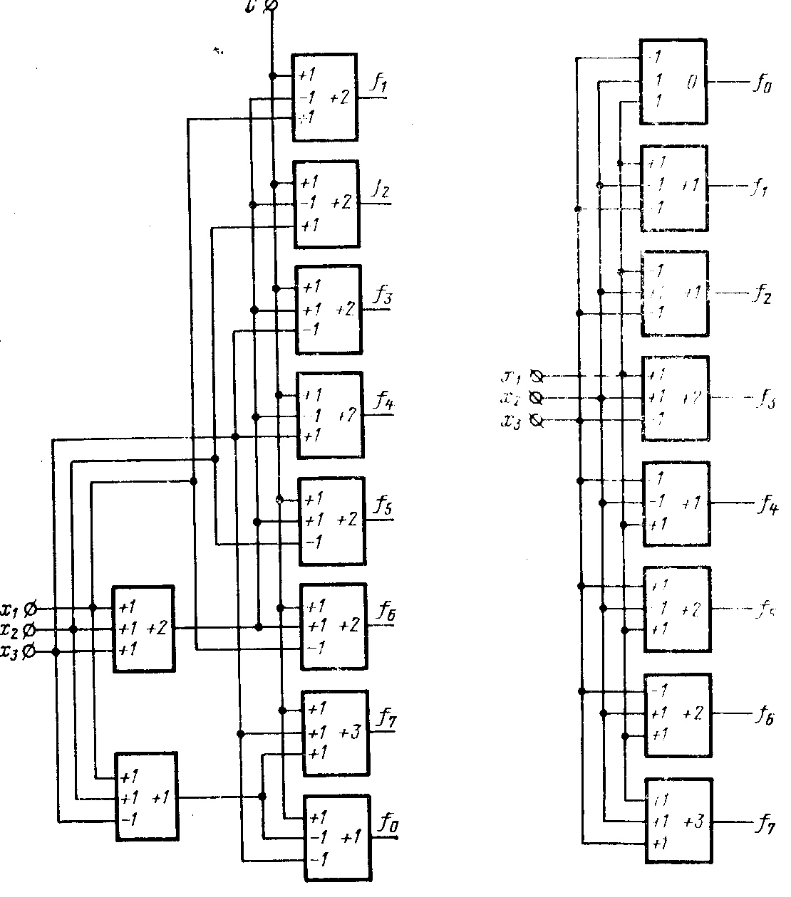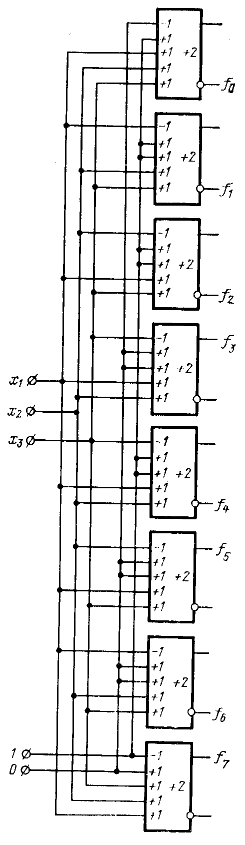 На рисунке 1 показана схема трёхвходового дешифратора на ПЭ. Характерная особенность этого дешифратора в том, что он использует только прямые значения аргументов и работает по синхронному принципу. Если на шину С подан высокий потенциал, то дешифратор открыт и работает надлежащим образом; если же на этой шине имеется низкий потенциал, соответствующий логическому 0, то дешифратор закрыт (блокирован) и на всех его выходах имеются нули. Очевидно, если убрать шину синхроимпульсов и снизить пороги элементов на единицу, то получим асинхронный дешифратор с выходными двухвходовыми элементами. Рис. 4. Асинхронный Восьмерично-двоичный шифратор Рис. 5. Синхронный восьмерично-двоичный шифратор на МЭ Рис. 6. Электрическая схема восьмерично-двоичного шифратора на переключателях тока При использовании многовходовых ПЭ с прямым и инверсным выходами дешифратор можно построить на однотипных элементах. На рисунке 3 показан двоично-восьмеричный дешифратор, построенный на однотипных ПЭ, каждый из которых имеет четыре входа с весами +1 и один вход с весом –1, порог +2, прямой и инверсный выходы. Необходимые функции дешифратора (1-1) этим элементом реализуются путём подключения некоторых входов к постоянным логическим уровням 0 или 1 и снятия информации с прямого или инверсного выхода элемента.Многоступенчатые дешифраторы на ФН и ПЭ строятся точно так же, как на булевых элементах. Поэтому их не будем рассматривать.