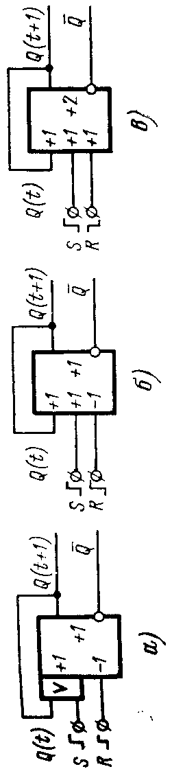 Изображая эту функцию в виде точечной диаграммы, а затем преобразуя её в пороговую диаграмму и синтезируя ФНО по алгоритму синтеза ФН, получим простейшую схему RS-триггера, показанную на рисунке 2-1а. Нетрудно проверить, что при отсутствии сигналов R и S (R=S=0) единичное состояние триггера, то есть возбуждённое состояние нейрона, устойчиво благодаря обратной связи с прямого выхода. Нулевое состояние триггера также устойчиво, так как оно соответствует невозбуждённому состоянию нейрона. При поступлении сигнала R=1 или S=1 состояние нейрона, следовательно, состояние триггера изменяется. По функции(2-2) можно синтезировать также другие варианты RS-триггера на ФНР, ФНЗ или ФНО, но они не проще данной схемы. Допустим