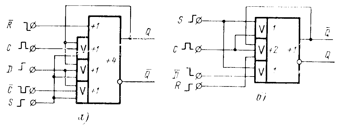 где логическая переменная С соответствует синхроимпульсу. Каждая из этих формул представляет функцию трёх переменных и выражается соответствующей точечной диаграммой. Синтезируя ФН, реализующие эти функции, получим два идентичных ПЭ с весами +1, +1, +2 и порогом +2. Оба эти ПЭ имеют общую входную переменную С, а по другим аргументам отличаются. Соединяя эти два ПЭ в соответствии с (2-4), получим схему синхронного RS-триггера, показанную на рисунке 2-2б. Если по функции (2-5) синтезировать ФНО, то получается нейрон с аналогичной структурой и другой полярностью синхроимпульса. Здесь и далее принимается, что вход (синапс) НЛЭ возбуждён, если на него подан высокий уровень потенциала. Рис. 2-3. Простые RSD-триггеры (защёлки) На рисунке 2-3 приведены схемы простых D-триггеров с R и S входами на ПЭ и ФН. Схемы построены таким образом, что в них полностью отсутствует соревнование (гонка) сигналов. В схемах входы R и S работают по асинхронному принципу, а информационный сигнал D записывается в триггер только при поступлении синхроимпульса. В схеме рисунка 2-3а, вход R работает по негативной логике, т.е. в нормальных условиях при отсутствии сигнала Уст. 0 на входе R имеется высокий уровень потенциала. Здесь используются как прямые, так и инверсные значения синхроимпульсов. В схеме рисунка 2-3б, прямым выходом триггера служит инверсный выход нейрона. Наиболее простой с точки зрения технической реализации является схема рисунка 2-3б. Рассмотрим