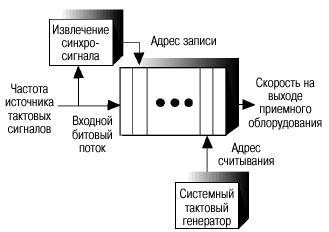 Рис. 1 – Буфер проскальзывания. Основной целью сетевой синхронизации является ограничение возникновения управляемых проскальзыва- ний. Существуют две основных причины возникновения проскальзываний. Первая причина-отсутствие частоты синхронизации из-за потери связи между генераторами, приводящее к различию тактовых частот. Вторая причина- разовые сдвиги либо в линиях связи (такие, как джиттер и вандер), либо между первичным и ведомым генераторами. Последнее, т.е. фазовые сдвиги между частотами первичного генератора и приемника, как будет показано выше, являются основной причиной возникновения проскальзываний в сетях связи. Проскальзывания, однако, не являются единственными сбоями, вызванными отсутствием синхронизации. Плохая синхронизация в сетях SDH может привести к избыточному джиттеру и потере кадров при передаче цифровых сигналов, как изложено в разделе "Необходимость синхронизации SDH ". В корпоративных (частных) сетях плохая синхронизация оборудования пользователя (СРЕ) может привести к возникновению пакетов (пучков) ошибок в цифровой сети. (См. "Пакеты ошибок, вызванные синхронизацией" на стр. 8). Поэтому, несмотря на то, что минимизация проскальзываний остается основной целью синхронизации, при проектировании сетей синхронизации необходимо рассматривать и другие сбои, связанные с синхронизацией. Влияние проскальзываний на предоставляемые услуги.Влияние одного или более проскальзываний на качество предоставляемых услуг в цифровых сетях связи зависит от типа этих услуг. Ниже описано влияние одиночных проскальзываний на различные виды услуг. При предоставлении услуг телефонной (голосовой) связи, как показано проскальзывания могут вызвать случайные звуковые щелчки. Эти щелчки не всегда слышны и не приводят к серьезным искажениям речи. Поэтому услуги телефонной связи некритичны к проскальзываниям. Частота появления проскальзываний до нескольких проскальзываний в минуту считается допустимой. Как показано на рис. 2, где рассматривается влияние управляемых проскальзываний на передачу факсимильных сообщений группы З, одиночные проскальзывания приводят к искажению или пропаданию строк в принятом факсимильном сообщении. Проскальзывание может вызвать пропадание до 8 сканированных линий. Это соответствует пропуску 0,08 дюйма вертикального пространства. На стандартной отпечатанной странице проскальзывание выглядит как отсутствие верхней или нижней половины отпечатанной строки. Длительное появление проскальзываний приведет к необходимости повторной передачи страниц, подвергшихся их влиянию. Повторная передача не может быть автоматизирована и осуществляется пользователем вручную. Влияние проскальзываний на передачу данных при помощи модемов проявляется в виде длинных пакетов ошибок. Продолжительность такого пакета ошибок зависит от скорости передачи данных и типа модема находится в диапазоне от 10 миллисекунд до 1,5 секунд. В период появления этих ошибок оконечное приемное устройство, подключенное к модему, принимает искаженные данные. В результате пользователь должен осуществить повторную передачу данных. При возникновении проскальзываний во время сеанса видеотелефонной связи происходит пропадание изображения. Абонентов просят повторно установить связь для восстановления изображения. Влияние