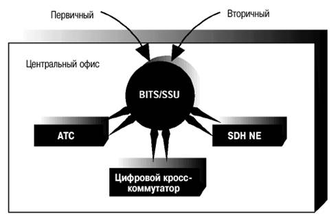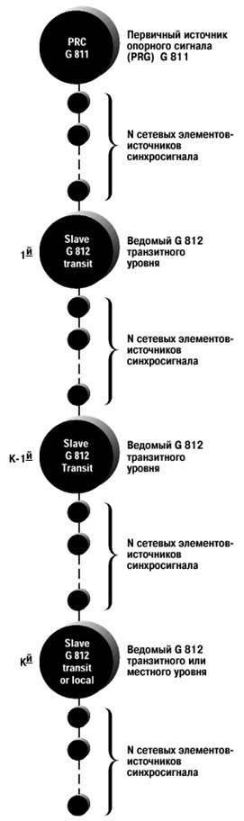 Multiplexor Мультиплексор ввода/вывода - МВВ Стремительное развитие цифровых систем коммутации и средств передачи информации, внедрение технологий SDH привело к значительному возрастанию роли систем синхронизации в сетях телекоммуникации. Новые сферы применения и виды предоставляемых услуг также вызывают повышенные требования к характеристикам и работе сетей синхронизации. Точная работа и тщательное планирование систем синхронизации требуется не только для того, чтобы избежать неприемлемых рабочих характеристик, но чтобы ослабить скрытые, дорогостоящие и трудноопределимые проблемы и уменьшить малозаметные взаимные влияния сетей различного подчинения. Данный документ содержит основные сведения о тактовой сетевой синхронизации. В Разделе I рассмотрены основы синхронизации и доказывается необходимость синхронизации сетей. В качестве примеров приведены некоторые виды сбое, вызванные плохим качеством синхронизации, такие как проскальзывание, пропуски кадров и пучки ошибок. Обсуждается влияние этих сбое на качество предоставляемых услуг и различных применений. В разделе II описываются различные архитектуры построения сетей синхронизации, используемые для поддержания приемлемого качества синхронизации. В этом разделе рассмотрены первичные эталонные источники (генераторы) и приемники сетевой синхронизации. Наряду с описанием функционального назначения этих источников синхронизации приводится относительная важность каждой функции для работы и планирования сетевой синхронизации. Раздел II завершает обслуживание требований к синхронизации ETSI, ANSI и ITU. В разделе III рассмотрены рабочие характеристики тактовой сетевой синхронизации. Показано влияние первичных эталонных генераторов, средств передачи синхронизации и приемников тактовой синхронизации на рабочие характеристики. В этом разделе показано, что частота тактовой синхронизации приемников обычно отличается от частоты первичного эталонного генератора, к которому они подсоединены. Такой сдвиг по частоте оказывает огромное влияние на рабочие характеристики сетей синхронизации. Раздел IV раскрывает основные принципы планирования сетевой синхронизации. Также обсуждаются наиболее общие проблемы планирования сети. 1. Необходимость синхронизацииОсновные положенияСинхронизация – это средство поддержания работы всего цифрового оборудования в сети связи на одной средней скорости. Для цифровой передачи информация преобразуется в дискретные импульсы. При передаче этих импульсов через линии и узлы связи цифровой сети все ее компоненты должны синхронизироваться. Синхронизация должна существовать на трех уровнях: битовая синхронизация, синхронизация на уровне канальных интервалов (time slot) и кадровая синхронизация. Битовая синхронизация заключается в том, что передающий и принимающий концы линии передачи работают на одной тактовой частоте, поэтому биты считываются правильно. Для достижения битовой синхронизации приемник может получать свои тактовые импульсы с входящей линии. Битовая синхронизация включает такие проблемы как джиттер линии передачи и плотность единиц. Эти проблемы поднимаются при предъявлении требований к синхронизации и системам передачи. Синхронизация канального интервала (time slot) соединяет приемник и передатчик таким образом, чтоб
