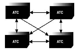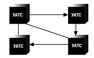 Рис. 6 – Иерархическая структура источник-приемник. Взаимная синхронизация.При взаимной синхронизации информация о синхронизации совместно используется всеми узлами сети (рис.7). Каждый генератор посылает и принимает сигналы эталонной синхронизации на все другие генераторы в сети. Синхронизация цепи определяется путем усреднения всех сигналов синхронизации, получаемых каждым генератором от всех других генераторов в сети. Теоретически, эта работа может обеспечить идентичные сигналы синхронизации на каждый узел, но в реальных условиях, при наличии несовершенных генераторов и несовершенной передачи информации о синхронизации, синхронизация подвержена флуктуации и стремится к общей частоте.