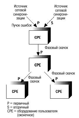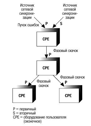 Рис. 2 - Выравнивание указателя. Однако, выравнивание указателя может привести к возникновению джиттера и вандера в передаваемом сигнале. Джиттер это быстрое (>10 Гц) изменение фазы сигнала («дрожание фазы»). Вандер - это медленное (<10 Гц) изменение фазы сигнала («дрейф фазы»). Избыточный джиттер SDH может привести к потере кадровой синхронизации. Избыточный вандер может вызвать проскальзывание на оконечном оборудовании. Поэтому целью синхронизации сетей SDH является, ограничение числа выравниваний указателя, осуществляемых сетевыми элементами SDH. Это достигается ограничением кратковременных шумов (<100 секунд) в сети синхронизации путем использования более стабильных тактовых генераторов на всей сети. Пакеты (паучки) ошибок, вызванные синхронизацией.В частных сетях синхронизация может вызвать дополнительные сбои (ухудшения) в форме пакетов ошибок. Рассмотрим частную сеть, в которой тактовые генераторы оборудования, размещенного на территории пользователя (СРЕ), соединены в цепь. Кратковременному ухудшение опорной частоты первого СРЕ повлияет на работу всего оборудования в цепи (см. Рис.3). В ответ на кратковременную ошибку большинство генераторов CPE выработает пакеты ошибок на всех выходных линиях. Второй генератор в цепи определит наличие ухудшения, вызванного первым генератором, и будет реагировать подобным образом, вырабатывая ухудшения (сбои) на всех своих выходах. Таким образом, пучок ошибок распространяется (и произвольно увеличивается) по всей сети СРЕ. Пучки ошибок, вызванные синхронизацией, по своей природе являются кратковременными переходными процессами и обычно мало отличаются от избыточно ошибочных линий передачи. Поэтому проблемы синхронизации могут быть ошибочно приняты за высокий коэффициент ошибок линий передачи. Таких трудностей можно избежать при использовании правильно разработанных генераторов СРЕ и при тщательном планировании распределения синхронизации в частной сети. Необходимо отметить, что такие проблемы пучков ошибок обычно не возникают в сетях общего пользования.