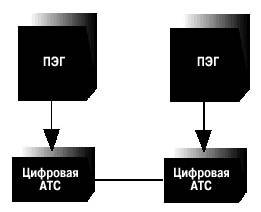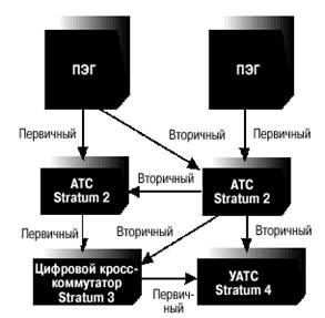 Рис. 5 – Плезиохронная работа Иерархический передатчик - приемник.Источник первичного эталонного сигнала в управляющем узле генерирует размноженный и распределенный эталонный сигнал синхронизации (рис.6). Управляющий узел посылает свой эталонный сигнал на принимающие узлы. Эталонный синхросигнал иерархически распределяется по сети. Двумя главными компонентами этой сети являются генераторы приемника, используемые для регенерации эталонного сигнала синхронизации, и цифровые тракты, используемые для передачи синхросигналов по сети.