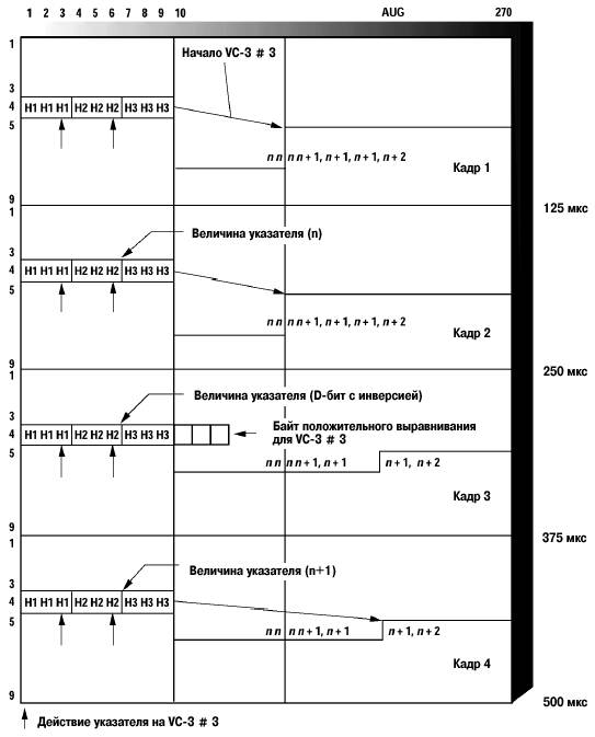 Рис. 7 – Режим взаимной синхронизации. Импульсное дополнение (стаффинг)Этот метод используется для передачи асинхронных потоков выше уровня DSI / EI. Цифровые потоки, подлежащие мультиплексированию, уплотняются дополнительными ложными импульсами. Это увеличивает их скорости до скорости независимого местного генератора. Исходящая скорость мультиплексора выше, чем сумма входящих скоростей. Ложные импульсы не несут никакой информации, они кодируются для идентификации. На стороне приемника ложные импульсы удаляются. Полученные пробелы в потоке импульсов затем удаляются, восстанавливая первоначальный поток данных. Указатели и выравнивание указателейSDH для переноса сигнала используют указатели полезной нагрузки. Указатель содержит фактический адрес начала виртуального контейнера на карте поля, отведенного под полезную нагрузку в структуре SDH. Разность фаз и частот между двумя сетевыми элементами (NE) в SDH может быть компенсирована с помощью указателей полезной нагрузки. Если передающий NE SDH работает быстрее приемного, последний будет создавать отрицательное выравнивание указателя и сдвигать полезную нагрузку вперед на один байт или восемь бит, как показано на рисунке 8(a). Таким образом приемный NE будет подстраиваться под передающий без потери информации. Аналогично, если передающий NE более медленный, чем приемный, возникнет положительное выравнивание указателя на один байт, как показано на рисунке 8(б). Размещение полезной нагрузкиСигналы DS3 размещаются в SDH с использованием вставки битов (стаффинга) для компенсации расхождения в тактировании между DS3 и SDH. Сигналы DS1 и E1 могут размещаться одним из четырех методов: асинхронное размещение, плавающее байт-синхронное размещение, фиксированное байт-синхронное размещение и бит синхронное размещение. При асинхронном размещении сигнал DS1 или E1 размещаются в VT1.5 или VC-12/1З асинхронно с использованием вставки битов для устранения расхождений в тактировании. Для определения начала кадра VT/VC используются указатели. При асинхронном размещении сигналы DS1 или E1 транспортируются без проскальзывания и без повторного тактирования. Однако система будет подвержена действию выравнивания указателей, которое будет происходить из-за возможной разности частот между сетевыми элементами в тракте передачи. Плавающее байт-синхронное размещение отличается от асинхронного тем, что не использует вставки битов для устранения расхождения в тактировании полезных нагрузок и сетевых элементов. Такое размещение обеспечивает прямой доступ к сигналам DS0. Однако при этом необходимо, чтобы DS1 или E1 были синхронизированы с сетевым элементом SDH. Любое расхождение в частотах между полезной входной нагрузкой и первым сетевым элементом SDH в тракте передачи ведет к появлению проскальзываний. Фиксированное байт-синхронное размещение не допускает использования какой бы то ни было вставки битов или указателей в процессе размещения. Следовательно, DS1 или E1 должен быть синхронизирован с сетевым элементом SDH. Для согласования тактирования по всему тракту транспортировки сигнала должен быть предусмотрен буфер проскальзывания. Бит-синхронное размещение аналогично фиксированному байт синхронному размещению, за исключением того, что при этом не предполагается, что структура DS1 или E1 организована в составе DS0. D