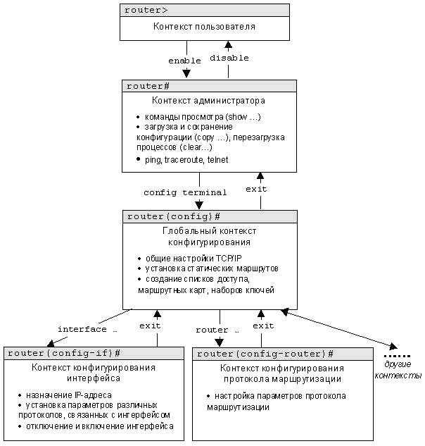 При роботі з командним рядком Cisco IOS передбачено декілька контекстів (режимів вводу команд). Поточний контекст ідентифікується символом запрошення вводу команди, який виводиться вслід за іменем маршрутизатора, наприклад Router> - контекст користувача; Router# - контекст адміністратора. Замість сигнатури "Router" виводиться назва маршрутизатора, якщо вона була специфікована. Контекст користувача –відкривається при підключенні до маршрутизатора і допускає виконання лише обмеженого набору основних контрольних команд, що не впливають на конфігурацію маршрутизатора. Якщо на протязі тривалого часу відсутні будь-які дії в контексті адміністратора, Cisco IOS автоматично переходить в контекст користувача. Контекст адміністратора –відкривається командою enable, поданою в контексті користувача. Контекст адміністратора надає доступ до всіх без винятку команд (команди, що дозволяють отримати повну інформацію про конфігурацію маршрутизатора та його поточний стан, команди переходу в режим конфігурування, команди збереження та завантаження конфігурації). Зворотній перехід до контексту користувача відбувається по команді disable або по закінченні встановленого часу неактивності. Контексти користувача та адміністратора можуть бути захищені паролями з метою запобігання несанкціонованого доступу незареєстрованих операторів, тому при вході до одного з цих контекстів може відбуватися запит пароля (Password:). При вводі пароля останній із міркувань безпеки на екрані терміналу не відображається. При роботі через сеанс TELNET пароль передається мережею у відкритому форматі; TELNET не вживає жодних засобів по забезпеченню захисту пароля від можливого перехоплення. Завершення сеансу роботи відбувається по команді exit. 2.2. Організація команд Cisco IOSКоманди Cisco IOS чітко структуровані і доступні в різних контекстах і для успішної роботи з системою команд важливим є розуміння того, в якому контексті які команди є доступними. Для спрощення орієнтування в ієрархії команд вигляд рядка запрошення має унікальний вигляд. На малюнку 2.2.1 наведена проста схематична діаграма деяких контекстів Cisco IOS. Кожна команда доступна лише на певному рівні ієрархії CLI (в певному контексті CLI). Наприклад, команди конфігурації не будуть доступними, поки інтерфейс не буде переведено на рівень глобального конфігурування командою configure. В таблиці 2.2.1 наведено перелік можливих контекстів та доступних команд системи команд. Таблиця 2.2.1. Контексти та доступні команди системи команд Cisco IOS
