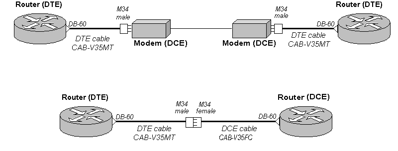 Малюнок 2.3.1. З'єднувачі DB-60 та SmallSerial послідовних інтерфейсів Cisco. В термінології Cisco кабель DTE підключається до пристрою DCE і навпаки, тобто тип кабеля вказує на тип маршрутизатора, а не тип зовнішнього обладнання. Кабелі DTE використовуються для підключення модема (малюнок 2.3.2.), а сукупність кабелів DTE-DCE –для з'єднання двох маршрутизаторів напряму (back-to-back), при цьому один із маршрутизаторів виступатиме в ролі DCE а інший -DTE.